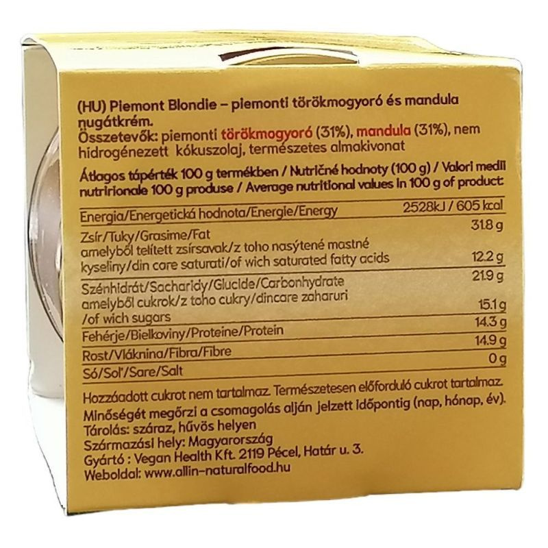 Összetevők: piemonti törökmogyoró, mandula, nem hidrogénezett kókuszolaj, természetes almakivonat.