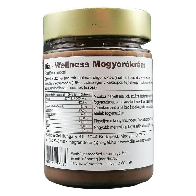 A mogyorókrémet használhatjuk önmagában, süteményekhez töltelékként, krémnek vagy akár Dia-Wellness palacsinta töltéséhez. Összetevők: növényi zsír, oligofruktóz, édesítőszer:maltitol, szukralóz, mogyorópép 15%, sovány kakaópor, tejfehérje.