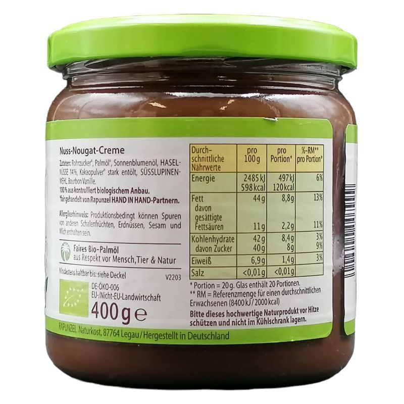 Összetétel: nádcukor, mogyoró (14%) keményítetlen pálmazsír, napraforgóolaj, sovány tejpor, alacsony zsírtartalmú kakaópor, emulgátor: szójalecitin, bourbon vanília. Valamennyi összetevő ellenőrzött ökológiai gazdálkodásból.