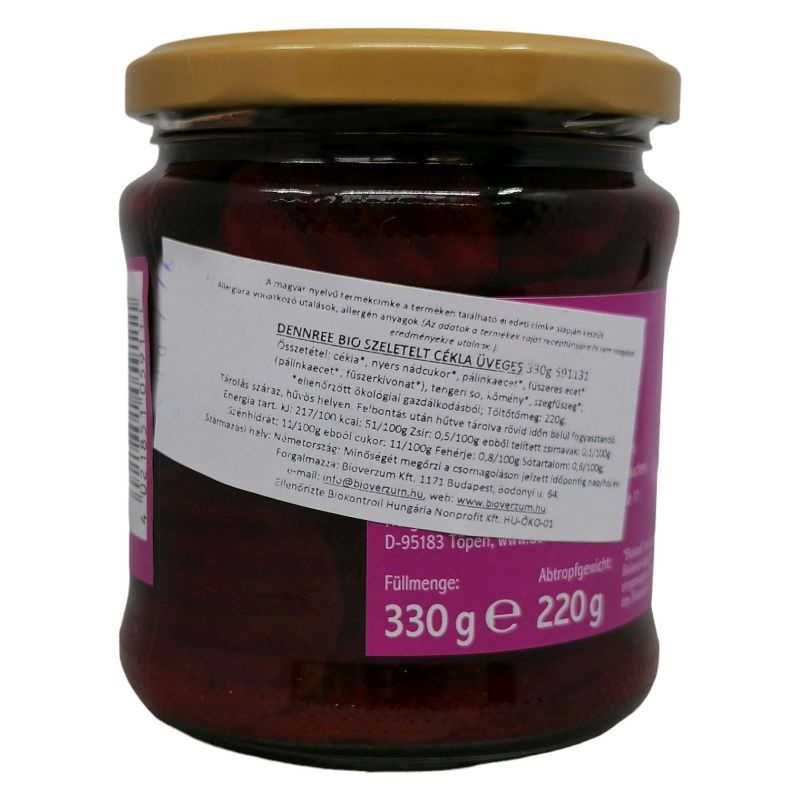 Összetétel: cékla*, nyers nádcukor*, pálinkaecet*, fűszeres ecet*. (pálinkaecet*, fűszerkivonat*) tengeri só, kömény*, szegfűszeg*, *= ellenőrzött ökológiai gazdálkodásból, töltőtömeg: 220 g. Tárolás száraz, hűvös helyen. Felbontás után hűtve tárolva rövid időn belül fogyasztandó.