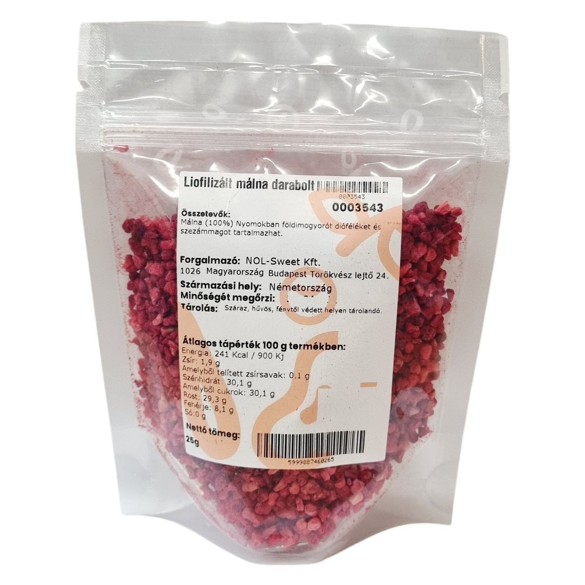 A termék Németországból származik, nettó tömege 25 g, és kiváló minőségű liofilizált málna darabolt formájában elérhető. Kódja 0003543. A termék csomagolása a frissesség megőrzését szolgálja, és a csomagoláson feltüntetett vonalkód 5999887460265.