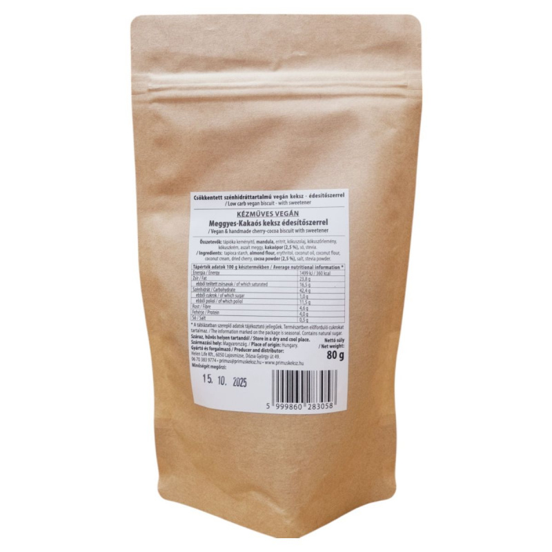 A kézműves Vegán Meggyes-Kakaós keksz egy ízletes, csökkentett szénhidráttartalmú édesség, amely édesítőszerrel készül. Ideális választás lehet azok számára, akik vegán étrendet követnek.