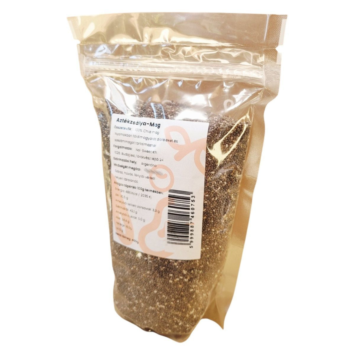 Az Aztékzsálya-Mag, más néven chia mag, egy Argentínából származó, 100% természetes élelmiszer, amelyet a Nol-Sweet Kft. forgalmaz. A termék gazdag rostforrás lehet, és különféle étrendekbe is beilleszthető. A chia mag nyomokban földimogyorót, dióféléket és szezámmagot tartalmazhat, ezért allergiások számára körültekintést igényel. A termék hosszú eltarthatóságának megőrzése érdekében száraz, hűvös és fénytől védett helyen tárolandó.