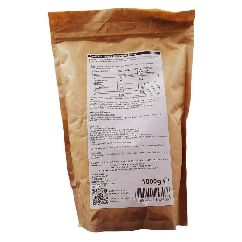 A termékeinkhez nem használunk állati eredetű termékeket, ezért szennyeződéstől mentesen garantáltan vegán a Szafi Free termékcsalád. Próbálja ki a többi Szafi Free termékünket is! A Szafi Free lángos lisztkeverék gluténmentes, élelmirost-forrás. Hozzáadott cukrot nem tartalmaz. Természetes módon előforduló cukrokat tartalmaz. Összetevők: gluténmentes lisztkeverék (hajdinaliszt, kölesliszt), tápióka keményítő, rostkeverék (bambuszrostliszt, úifűmaghéjliszt), térfogatnövelő szer (nátrium-hidrogén-karbonát), só, savanyúságot szabályzó anyag (citromsav). A termék szezámmagot, mustármagot, zellert tartalmazhat!