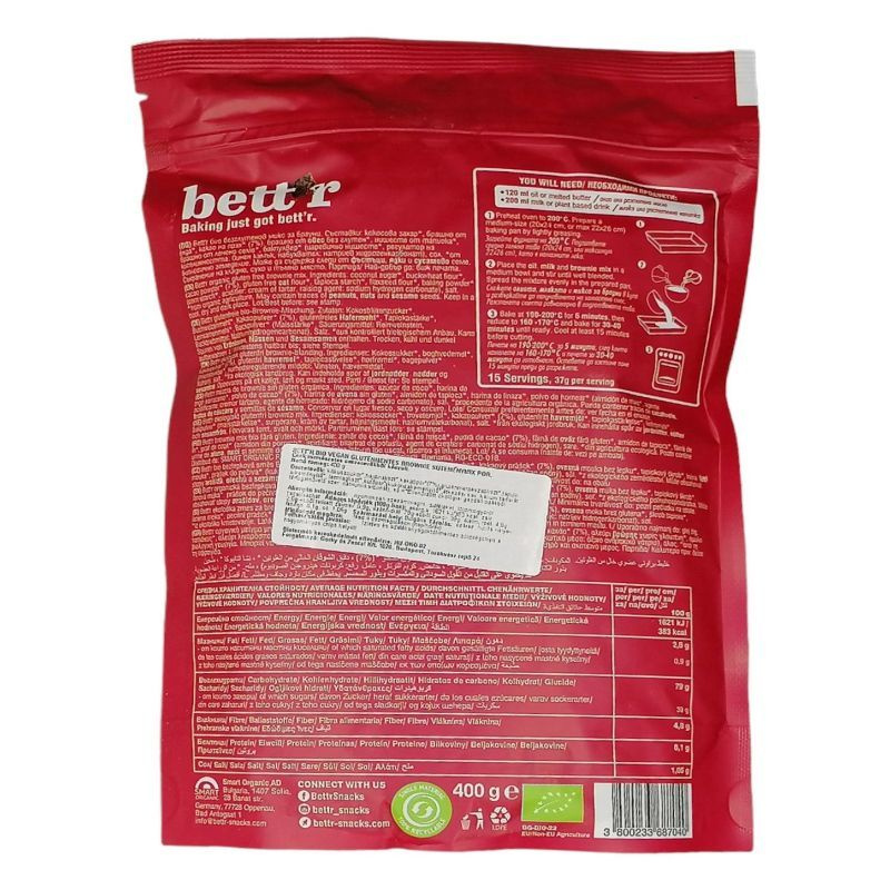 Összetevők: Kókuszcukor*,hajdinaliszt*,kakaópor*(7%),gluténmentes zabliszt*,tápióka-keményítő*, lenmagliszt*,sütőpor*(kukoricakeményítő*,étkezési sav: kálium tartarát, térfogatnövelő szer: nátrium-karbonát), só.*összetevők bio gazdálkodásból