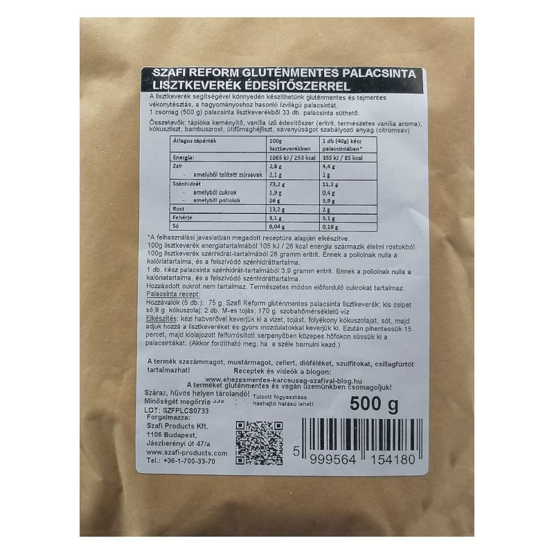 A lisztkeverék segítségével könnyedén készíthetünk gluténmentes és tejmentes vékony tésztás, a hagyományoshoz hasonló ízvilágú palacsintát. 1 csomag (500 g) palacsinta lisztkeverékből 33 db. Palacsinta süthető. A lisztkeverék 100 g energiatartalmából 104 kJ/26 Kcal energia származik élelmi rostokból. A lisztkeverék 100 g szénhidrát-tartalmából 26 g eritrit. Ennek a poliolnak nulla a kalóriatartalma, és a felszívódó szénhidráttartalma. 1 db. Kész palacsinta (40 g) szénhidrát-tartalmából 3,9 g eritrit. Ennek a poliolnak nulla a kalóriatartalma, és a felszívódó szénhidráttartalma. Hozzáadott cukrot nem tartalmaz. Természetes módon előforduló cukrokat tartalmaz. Felhasználási javaslat: palacsinta recept: hozzávalók (5 db-hoz): 75 g. Szafi Reform gluténmentes palacsinta lisztkeverék, kis csipet só, 8 g. Kókuszolaj, 2 db. M-es tojás, 170 g. Szoba hőmérsékletű víz. Elkészítés: kézi habverővel keverjük ki a vizet, tojást, folyékony kókuszolajat, sót, majd adjuk hozzá a lisztkeveréket és gyors mozdulatokkal keverjük ki. Ezután pihentessük 15 percet, majd kiolajozott felforrósított serpenyőben közepes hőfokon süssük ki a palacsintákat. (akkor fordítható meg, ha a széle barnulni kezd.)