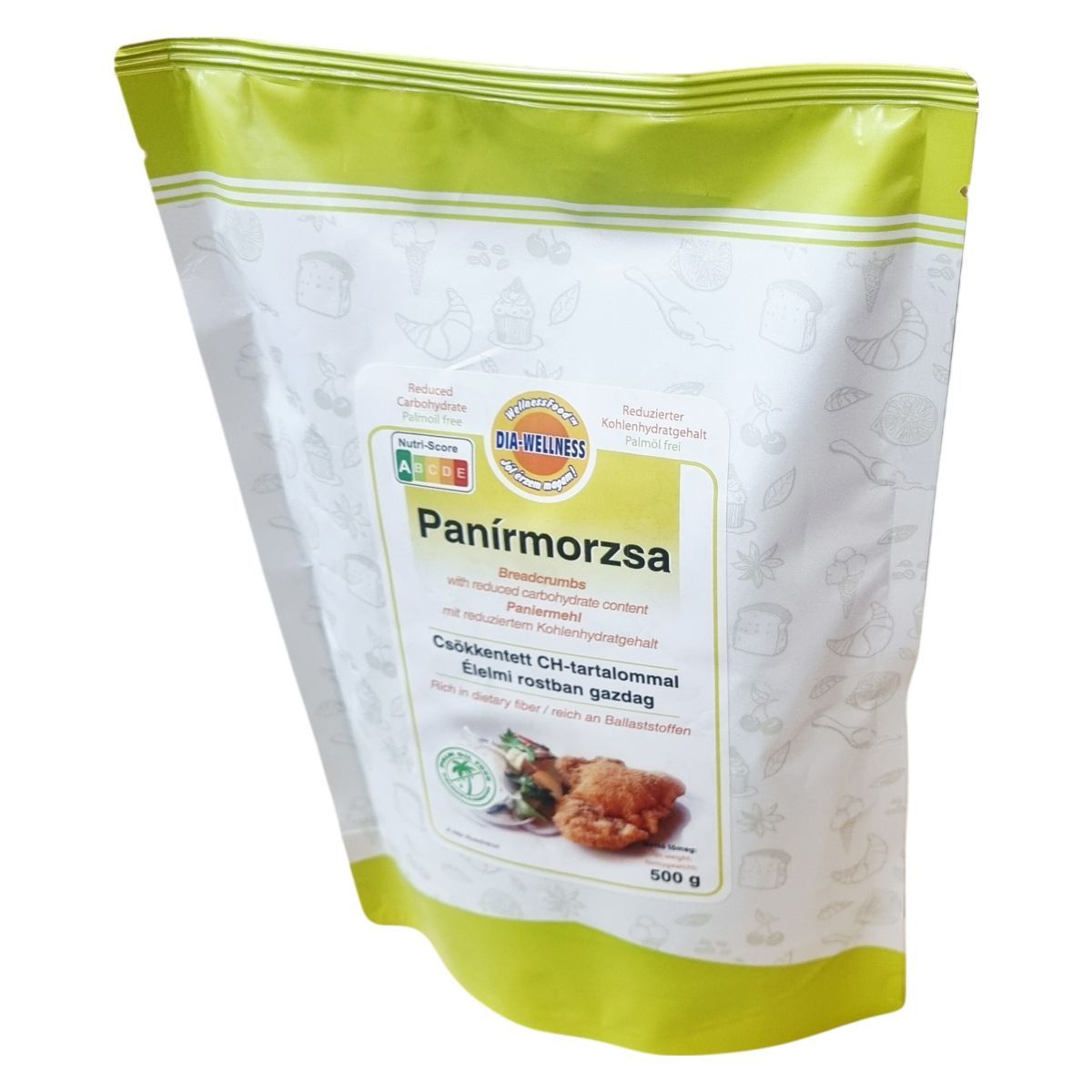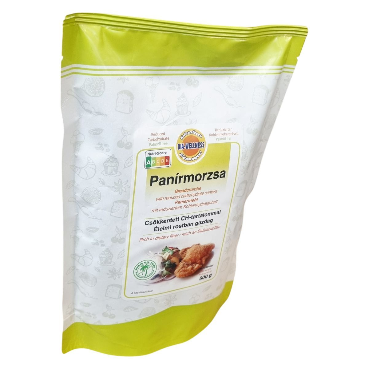 A Dia-Wellness Panírmorzsa csökkentett szénhidráttartalmú, élelmi rostban gazdag termék, amely hozzájárul a fehérjetartalmán keresztül a normál csontozat fenntartásához. A termék pálmaolajmentes, és részben búzafehérjéből, növényi olajból, polidextrózból, búzalisztből, élesztőből és rozmaring kivonatból áll. Az adatok számolt értékek, a termék egyaránt alkalmas változatos és kiegyensúlyozott táplálkozás részeként. A panírmorzsa előállítása során földimogyorót, dióféléket, tejtermékeket és glutént tartalmazó gabonákat is feldolgozó üzemet alkalmaznak, ezért ezen allergének előfordulhatnak. A termék nettó tömege 500 g, és átfogó Nutri-Score besorolással rendelkezik, kiemelve a csökkentett szénhidráttartalmat és a pálmaolajmentességet. A csomagoláson jelzett, hogy a kép illusztrációként szolgál.