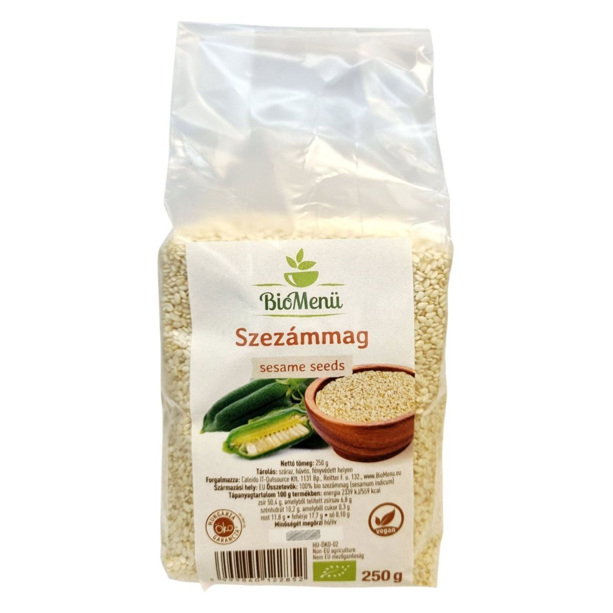 A BioMenü Szezámmag egy kiváló minőségű, 100% bio szezámmag termék, amely az EU-ból származik. A termék gazdag energiaforrás, magas zsírtartalommal és jelentős fehérje-, rost- és szénhidráttartalommal rendelkezik. A szezámmag ideális választás lehet különféle ételek kiegészítésére, és hozzájárulhat az egészséges étrend fenntartásához. A terméket száraz, hűvös és fényvédett helyen ajánlott tárolni, hogy megőrizze minőségét. A forgalmazó a Caleido IT-Outsource Kft., és a termék rendelkezik a HU-ÖKO-02 tanúsítvánnyal, amely igazolja a bio minőséget.