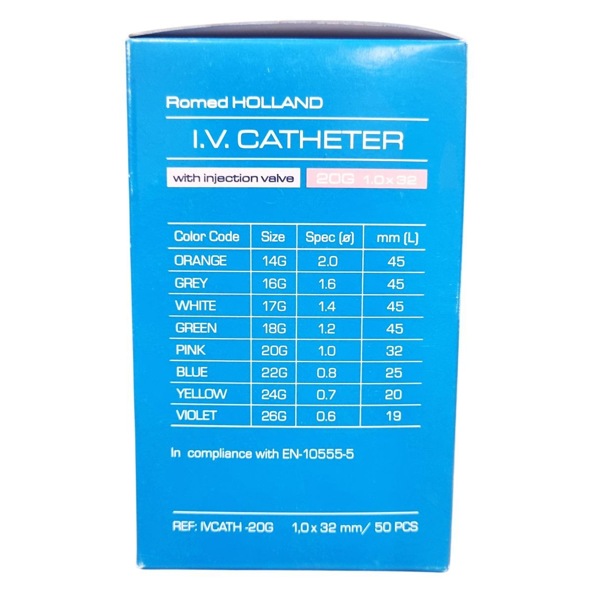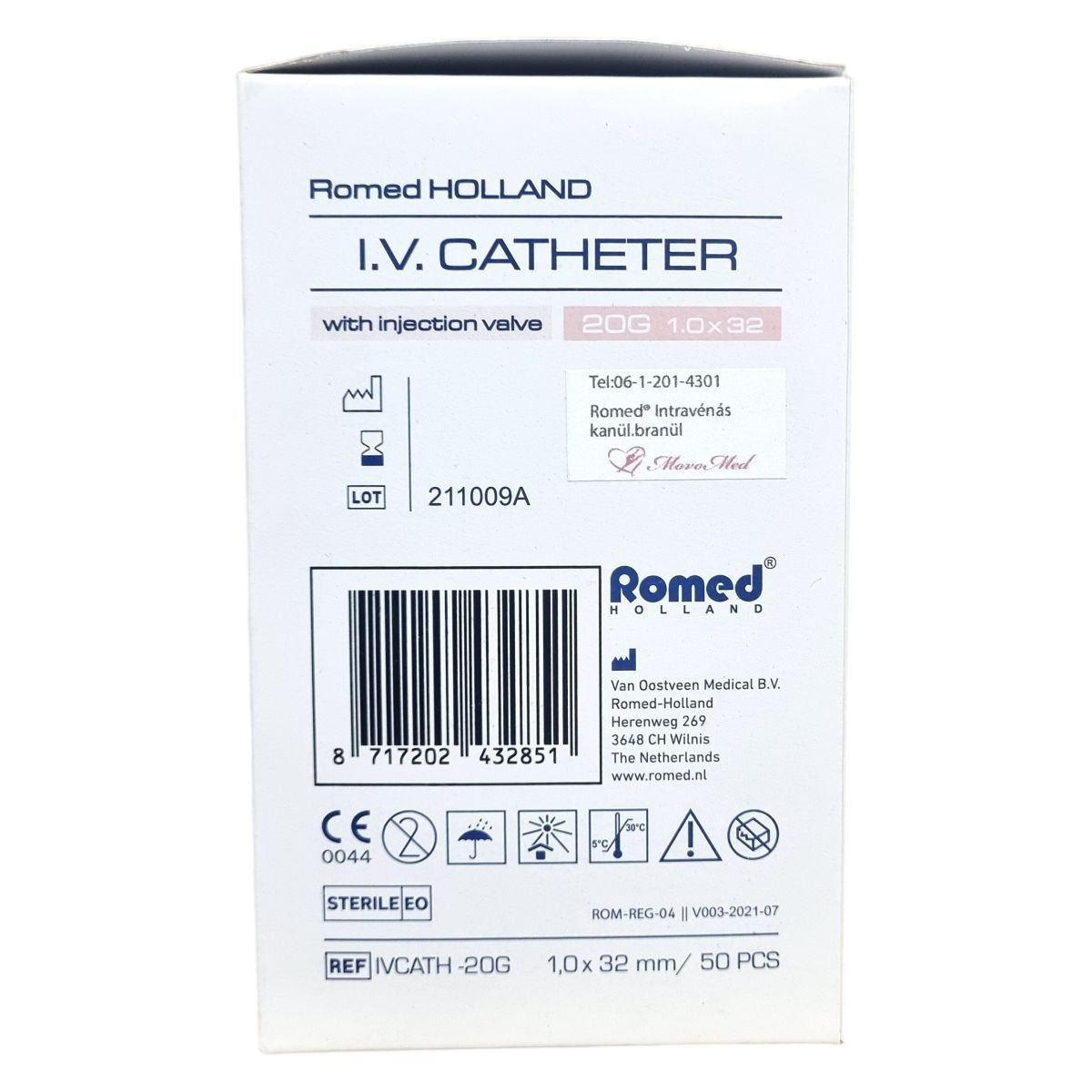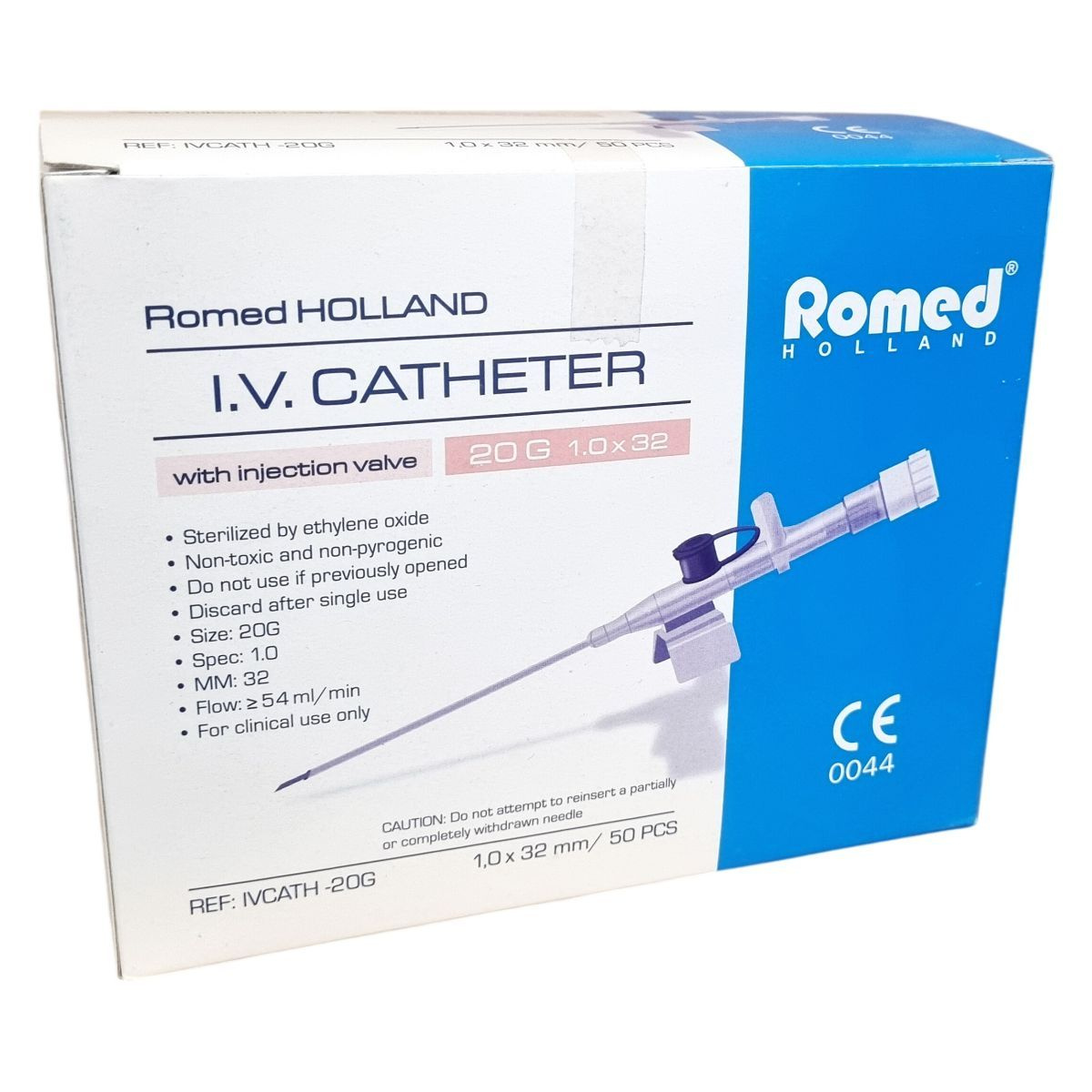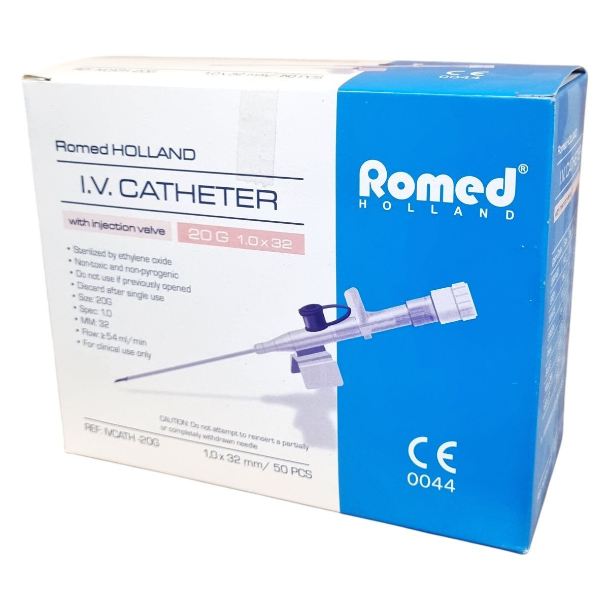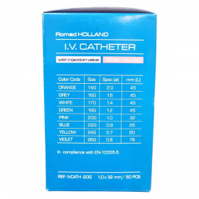 A Romed Holland I.V. katéter egy steril, etilén-oxiddal sterilizált eszköz, melyet egyszeri használatra terveztek, így használat után eldobandó. A kanül 20G méretű, 1,0 mm átmérőjű és 32 mm hosszú, szeleppel ellátott kialakítással, mely megkönnyíti az injekció beadását. Az eszköz megfelel az EN-10555-5 szabványnak, különböző színkódokkal és méretekkel érhető el az eltérő klinikai igényekhez. A termék non-toxikus és non-pyrogén, kizárólag klinikai használatra készült, használata során garantálja a legalább 54 ml/perc áramlási sebességet. Az injekciós szelep használatával biztonságosabbá válik a gyógyszeradagolás, csökkentve az esetleges fertőzés kockázatát. Gyártóként a Van Oostveen Medical B.V., Hollandia ismert, és a termék rendelkezik CE tanúsítvánnyal.