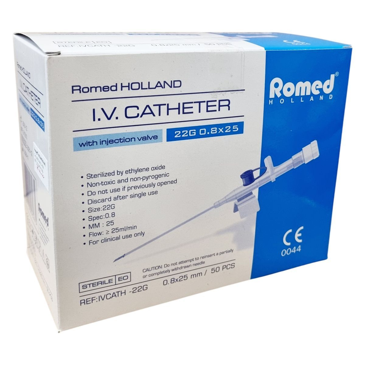 A Romed HOLLAND I.V. katéter injekciós szeleppel 22G méretben készült, 0.8 mm átmérővel és 25 mm hosszúsággal. A termék steril, etilén-oxiddal sterilizált, és kizárólag klinikai használatra alkalmas. A katéter az EN-10555-5 szabványnak megfelel, és többszörösen bevizsgált. Többféle méretben és színkódokkal elérhető, melyek az adott átmérőt és hosszúságot jelzik. A termék kizárólag egyszeri használatra készült, nem újra sterilizálható vagy használható vissza, a fertőzésveszély minimalizálása érdekében. A termék csomagolása 50 darabot tartalmaz, és megfelel az európai minőségi és biztonsági előírásoknak.