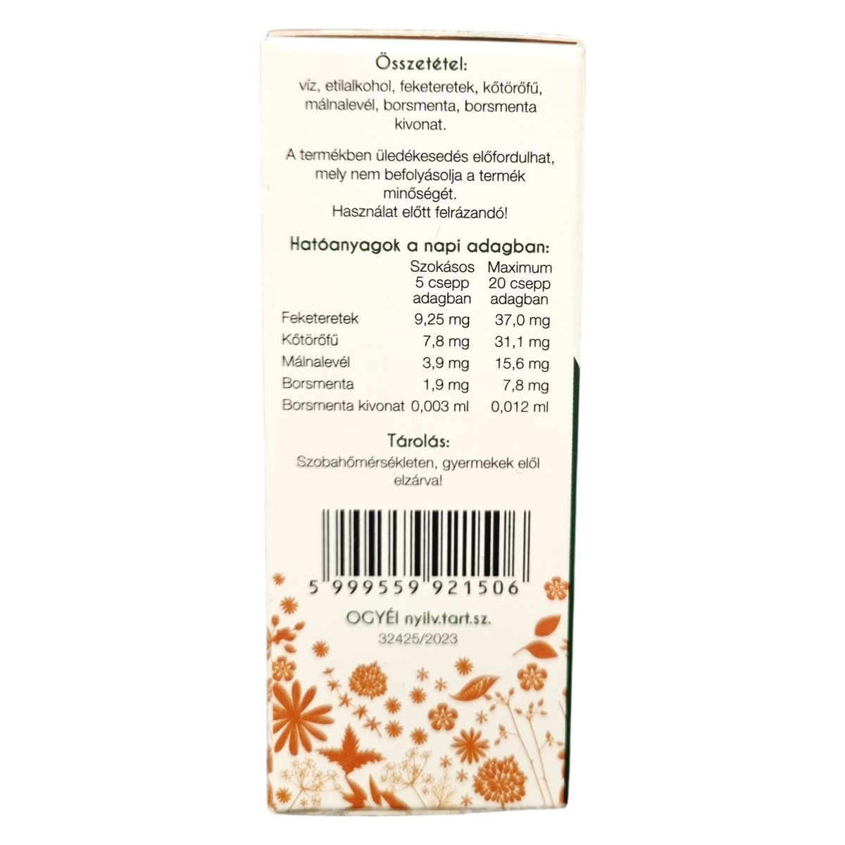 Szokásos napi adag: 5 csepp kevés folyadékban elkeverve, étkezés előtt.