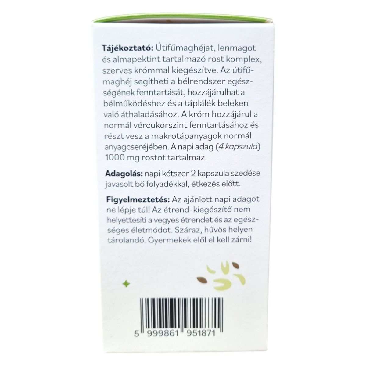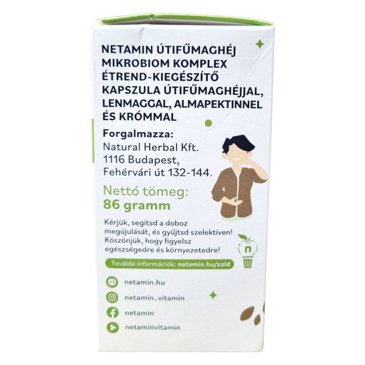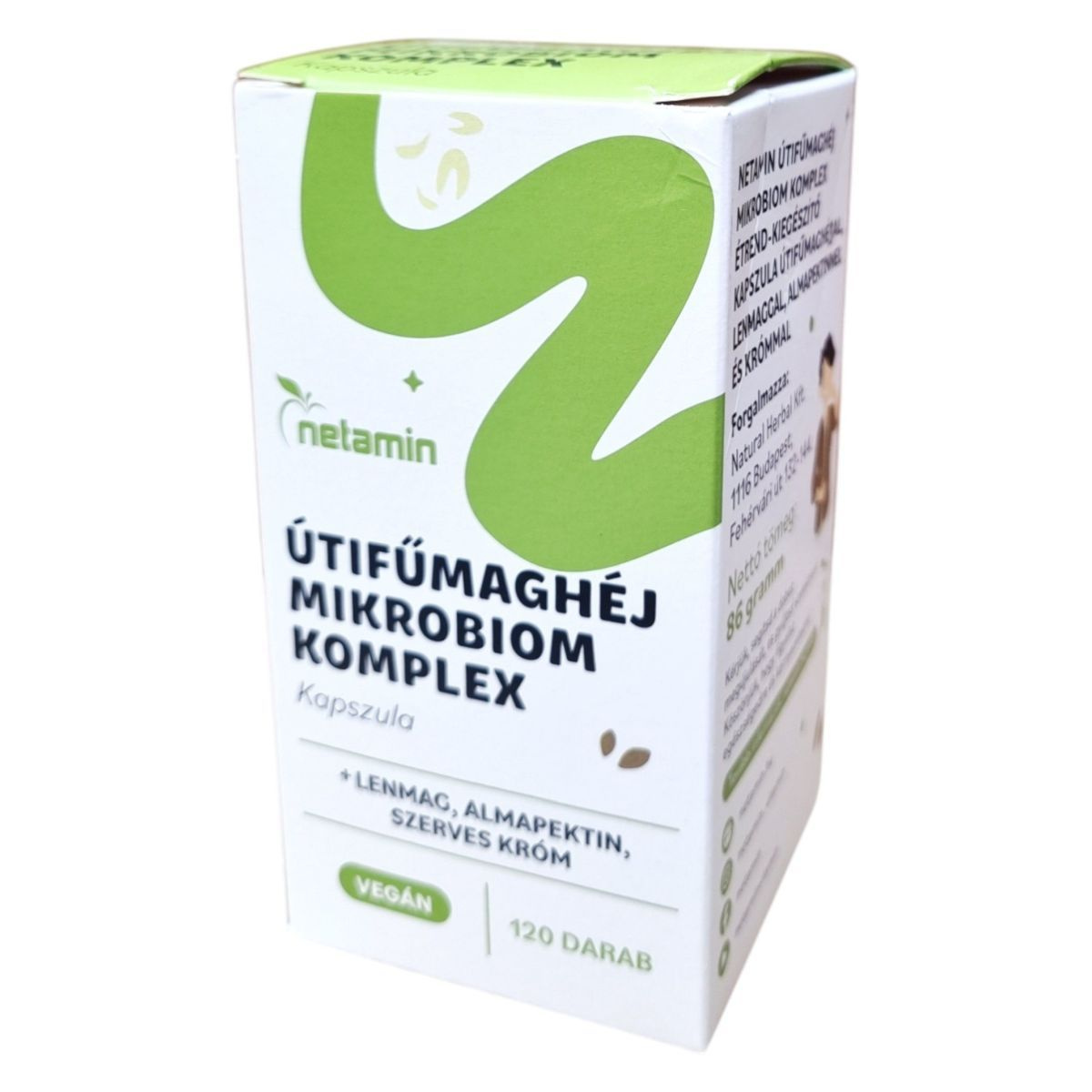 A Netamin Útifűmaghéj Mikrobiom Komplex kapszula egy speciális étrend-kiegészítő, amely útifűmaghéjat, lenmagot, almapektint és szerves krómot tartalmaz. Az útifűmaghéj segítheti a bélrendszer egészségének fenntartását, és hozzájárulhat a bélműködéshez. A króm részt vehet a normál vércukorszint fenntartásában és a makrotápanyagok normál anyagcseréjében. A termék vegán, és napi adagja 1000 mg rostot biztosít. A kapszulák bő folyadékkal, étkezés előtt fogyasztandók. Fontos, hogy az ajánlott napi adagot ne lépje túl, és az étrend-kiegészítő nem helyettesíti a vegyes étrendet és az egészséges életmódot.