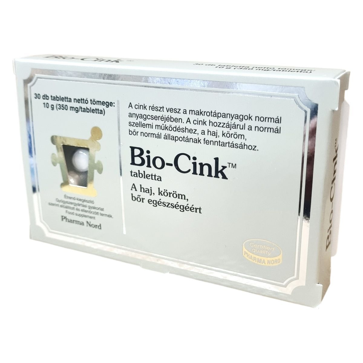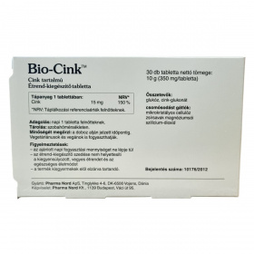 A Pharma Nord által gyártott Bio-Cink™ tabletta egy étrend-kiegészítő, amely gyógyszergyártási gyakorlat szerint készül és ellenőrzött minőséget képvisel. A tabletta 350 mg tömegű, egy doboz 30 darabot tartalmaz, összesen 10 g nettó tömeggel. A cink hozzájárulhat a makrotápanyagok normál anyagcseréjéhez és a szervezet számos funkciójához, különösen a normál szellemi működéshez, valamint a haj, köröm és bőr egészségének támogatásához. A termék alkalmas vegetáriánusok és vegánok számára egyaránt, csomósodást gátló anyagokat is tartalmaz. A hatóanyag fő forrása a cink-glukonát, a tabletta összetevői közt glukóz, mikrokristályos cellulóz, magnéziumsók és szilícium-dioxid is megtalálhatók.