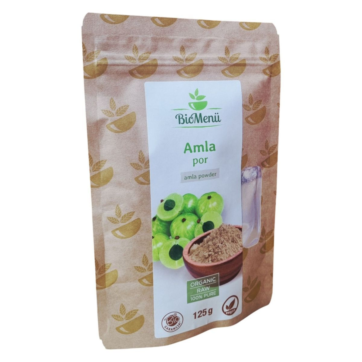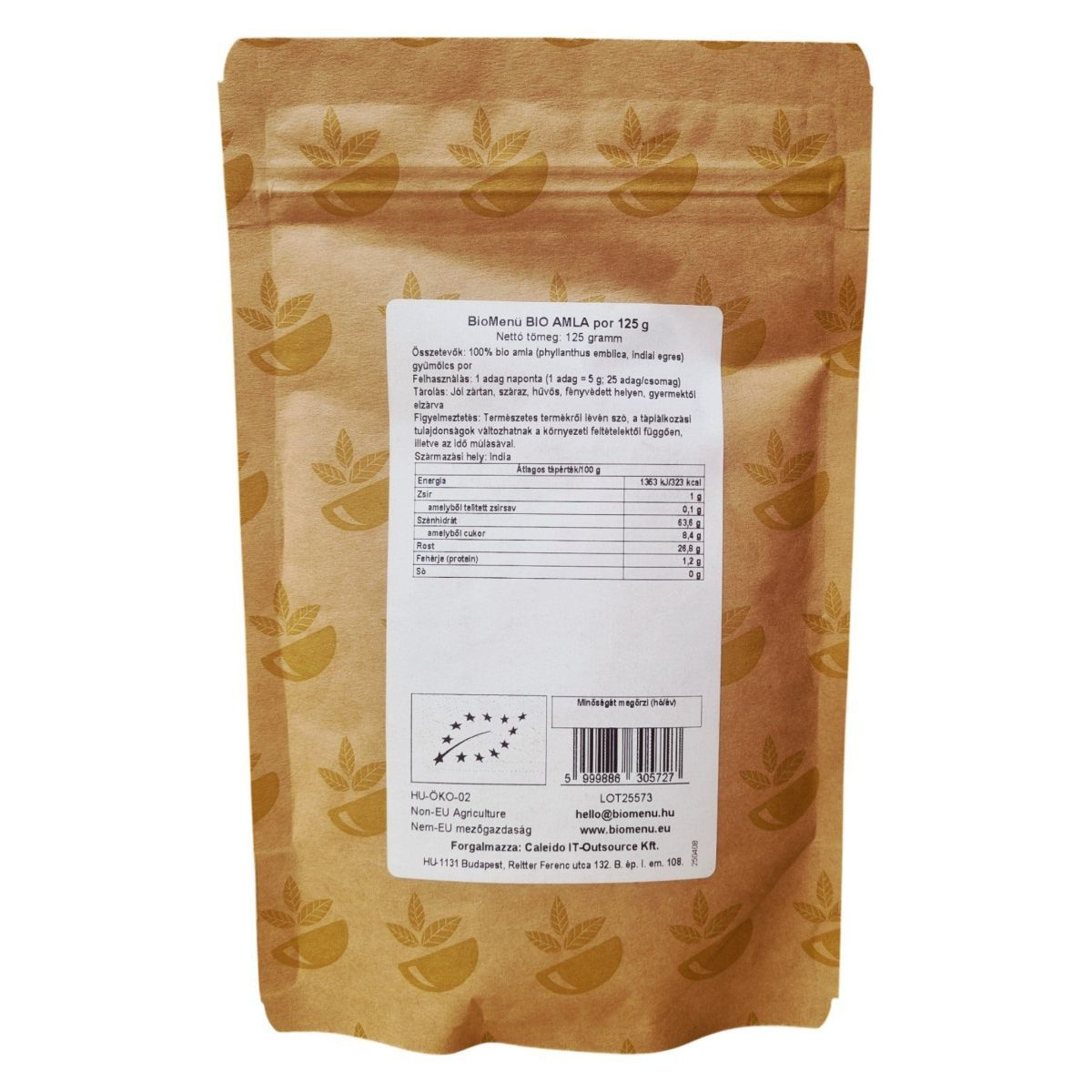 A BioMenü BIO AMLA por 125 g kiszerelésben kapható, és 100% bio amla gyümölcs port tartalmaz, amely Indiából származik. Az amla, vagy más néven indiai egres, egy népszerű szuperélelmiszer, amely antioxidánsokban és vitaminokban gazdag. A termék bio, raw és vegán étrendi irányzatoknak is megfelel. Az amla por rendszeres fogyasztása hozzájárulhat az egészséges életmódhoz. A terméket jól zártan, száraz, hűvös és fényvédett helyen kell tárolni, gyermektől elzárva. A termék HU-ÖKO-02 engedélyszámmal rendelkezik, és a Caleido IT-Outsource Kft. forgalmazza.