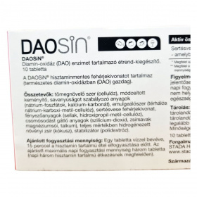 A DAOSiN tabletta a természetes diamin-oxidáz enzim kiegészítésére szolgálhat, amely a hisztamin lebontásában játszik szerepet. Fogyasztása támogathatja a hisztamin-anyagcsere egyensúlyát, különösen hisztaminban gazdag ételek fogyasztása esetén.