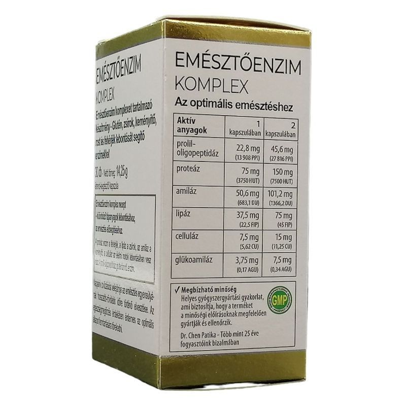 Emésztőenzim komplexet tartalmazó készítmény glutén, zsírok, keményítő, rost és fehérjék lebontását segítő enzimekkel.