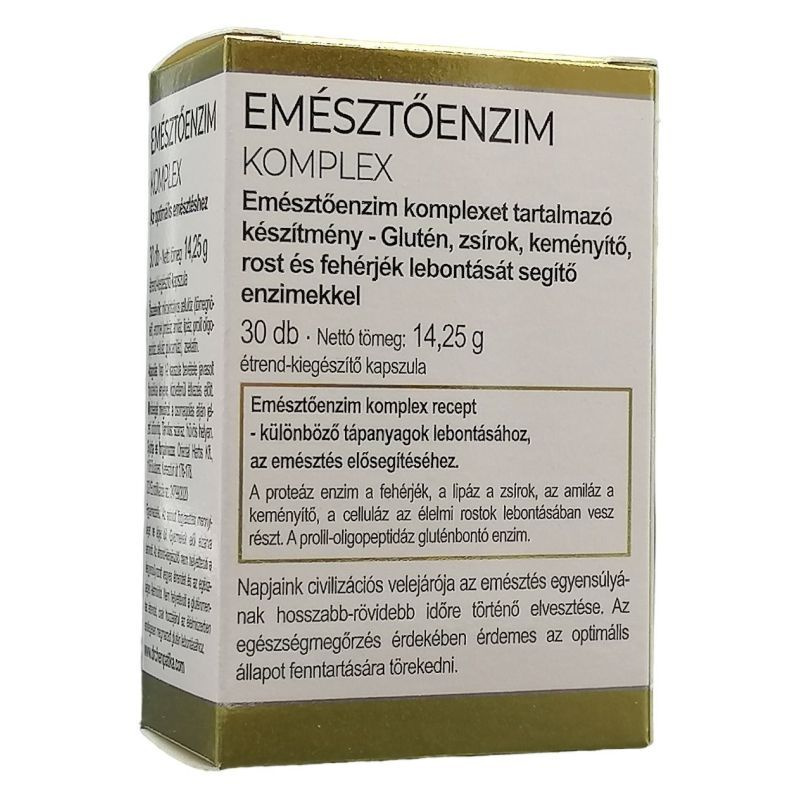 Emésztőenzim komplex recept - különböző tápanyagok lebontásához, az emésztés elősegítéséhez. A proteáz enzim a fehérjék, a lipáz a zsírok, az amiláz a keményítő, a celluláz az élelmi rostok lebontásában vesz részt. A prolil-oligopeptidáz gluténbontó enzim. Napjaink civilizációs velejárója az emésztés egyensúlyának hosszabb-rövidebb időre történő elvesztése. Az egészségmegőrzés érdekében érdemes az optimális állapot fenntartására törekedni.