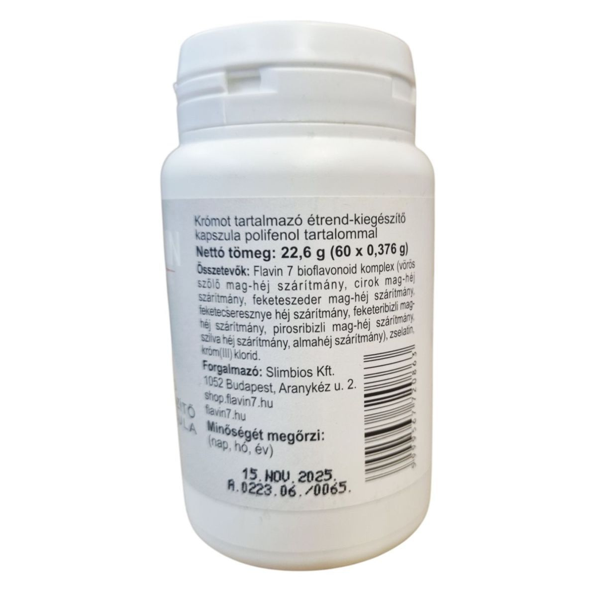 A FLAVITAMIN FLAVIN7 BIOFLAVONOID Cr étrend-kiegészítő kapszula krómot és bioflavonoidokat tartalmaz, amelyek hozzájárulhatnak a makro-tápanyagok normál anyagcseréjéhez és a normál vércukorszint fenntartásához. A termék összetevői között megtalálható a Flavin 7 bioflavonoid komplex, amely különböző gyümölcsök mag- és héjszárítmányaiból áll. A kapszula napi ajánlott bevitele 1 darab, és fontos, hogy ne lépje túl az ajánlott mennyiséget. A termék nem helyettesíti a kiegyensúlyozott étrendet és az egészséges életmódot, és kisgyermekektől elzárva tartandó. A Slimbios Kft. által forgalmazott termék minőségét 2025. november 15-ig őrzi meg.