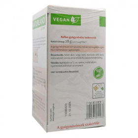 Nettó tömeg: 28 g (20 x 1,4 g filter). A gyógynövények természetes módon támogatják a gyomor-bélrendszer egészségét. Alkalmazás: 1 filtert 1 csészényi (kb. 2,5 dl) forrásig melegített vízzel öntsön le, majd lefedve 10 percig hagyja állni! Lehetőleg ízesítés nélkül, az étkezések között, naponta 2‒3 x 1 csészényi teaital fogyasztható. Tárolás: legfeljebb 25 °C-on, száraz, tiszta helyen. Gyermekek elől elzárva tartandó!