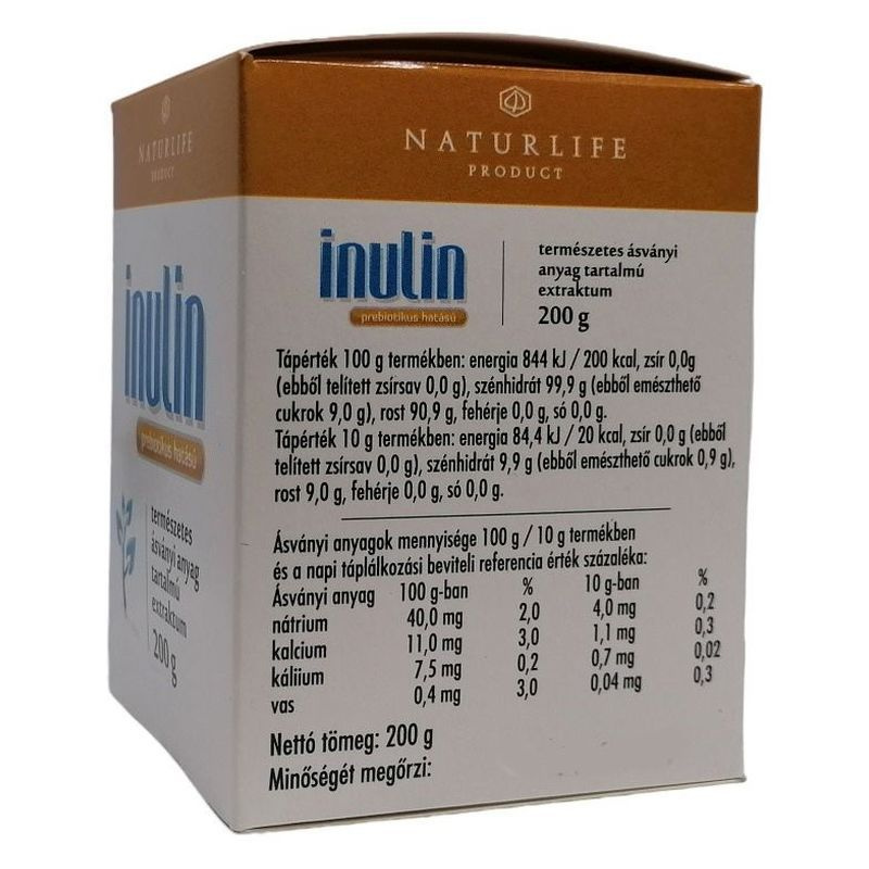 Természetes élelmi rost forrás, prebiotikus hatású lehet. Könnyen emészthető, vízben oldódó szénhidrátot tartalmaz, amely a hasznos bélbaktériumok táplálékául szolgál. Ásványi anyag tartalom 100 g termékben: nátrium 0,1 mg, kalcium 11,0 mg, kálium 7,5 mg, vas 0,4 mg. Nettó tömeg: 200 g.