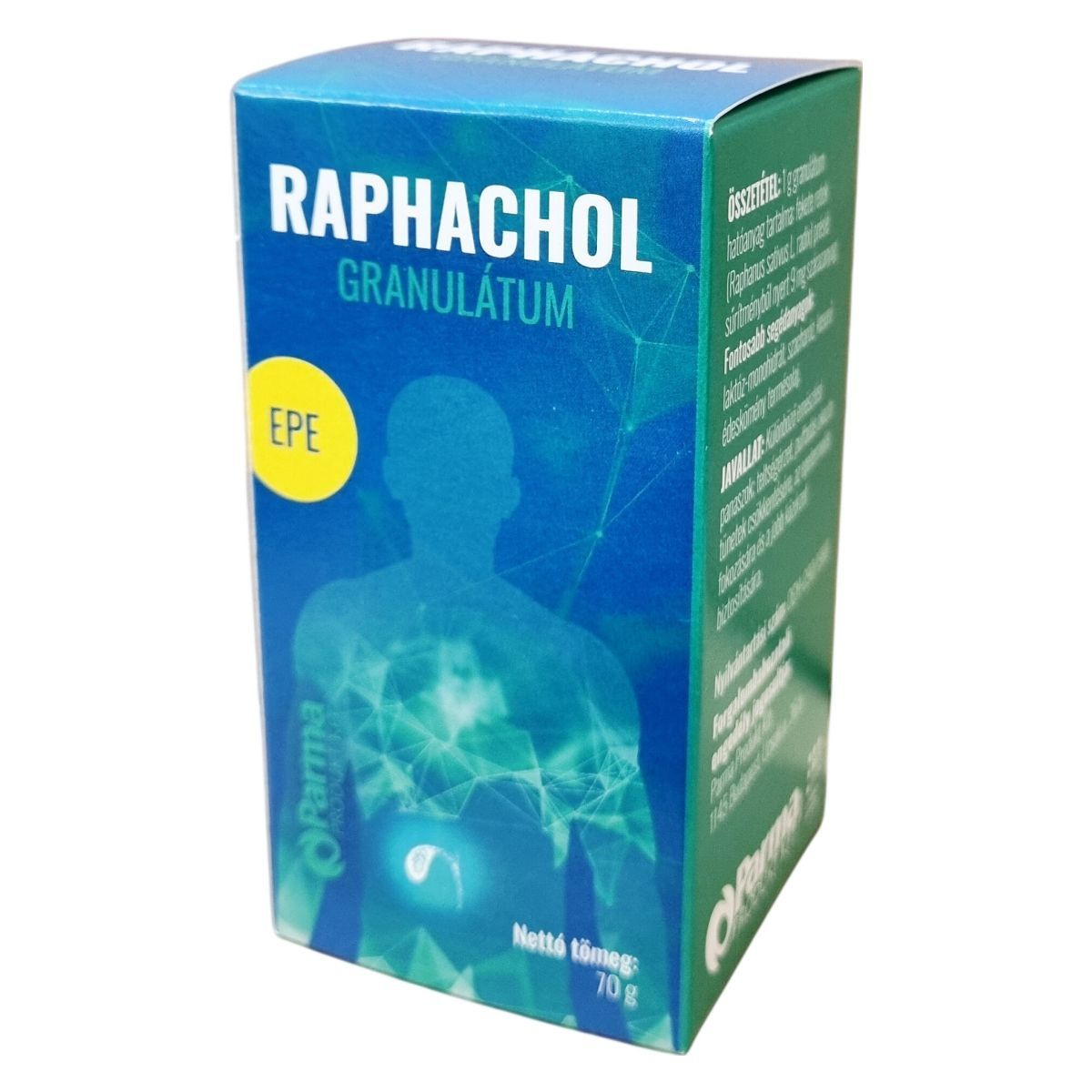 A RAPHACHOL granulátum egy gyógyszernek nem minősülő gyógyhatású készítmény, amelynek hatását népgyógyászati és szakirodalmi adatok igazolják. A termék egy 70 grammos granulátum, amely fekete retek préslé sűrítményéből nyert hatóanyagot tartalmaz, valamint olyan segédanyagokat, mint laktóz-monohidrát, szacharóz és keserű édeskömény termésolaj. A készítményt különféle emésztési panaszok, köztük teltségérzet és puffadás esetén, valamint az epetermelés fokozására és a jobb közérzet elősegítésére ajánlják. Az adagolás felnőttek és gyermekek számára is ajánlott, és javasolt főétkezések után bevenni megfelelő mennyiségű folyadékkal. A termék tárolása a 25 °C alatti hőmérsékletet igényli, és fontos, hogy gyermekek elől elzárva legyen.