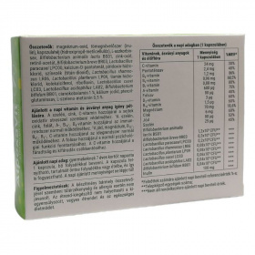 Összetevők: C-vitamin: 24 mg, pantoténsav: 2,4 mg, B6-vitamin: 1,2 mg, B2-vitamin: 0,96 mg, B1-vitamin: 0,88 mg, A-vitamin: 600 µg, folsav: 80 µg, D3-vitamin: 3 µg, B12-vitamin: 1,5 µg, magnézium: 70 mg, cink: 6 mg, jód: 80 µg, szelén: 25 µg, Bifidobacterium animalis lactis BS01 1,2x109 CFU, Bifidobacterium breve BR03 0,3x109 CFU, Lactobacillus paracasei LPC00 0,2x109 CFU, Lactobacillus rhamnosus LR06 0,08x109 CFU, Lactobacillus plantarum LP09 0,08x109 CFU, Lactobacillus casei LC03 0,06x109 CFU, Lactobacillus acidophilus LA02 0,04x109 CFU, Bifidobacterium bifidum BB01 0,04x109 CFU, inulin: 100 mg.