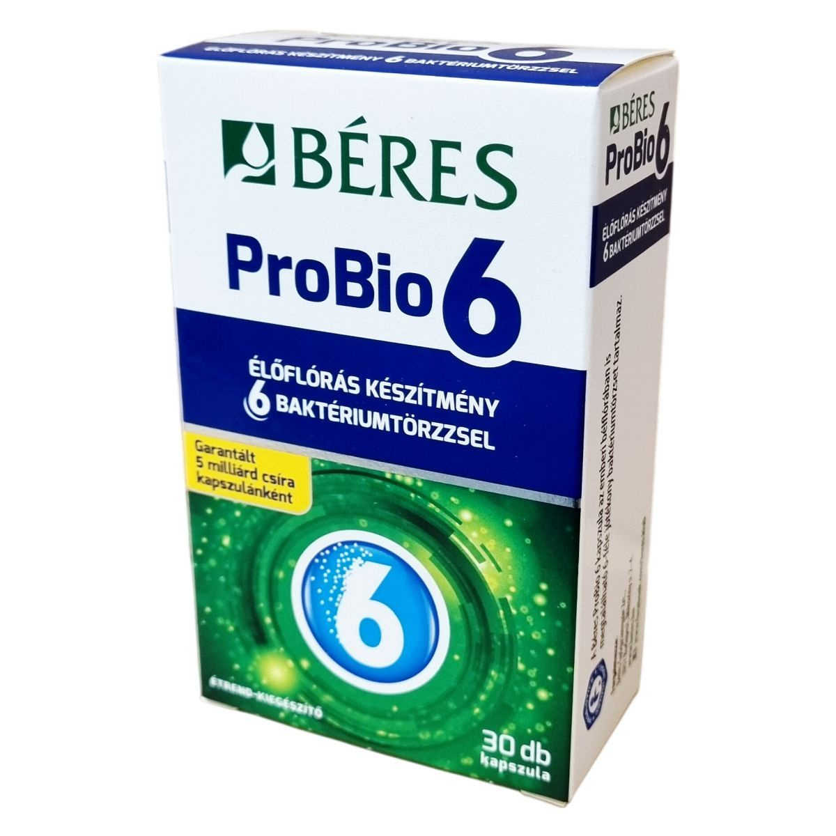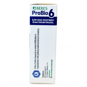 A Béres ProBio 6 kapszula olyan élőflórás étrend-kiegészítő, amely hatféle, az emberi bélflórában is megtalálható jótékony baktériumtörzset tartalmaz. A termék garantáltan legalább 5 milliárd élő baktériumot tartalmaz kapszulánként, ami 30 adagolást biztosít egy dobozban. Az összetevők között megtalálhatók a baktérium törzsek mellett a burgonyakeményítő, csomósodást gátló anyagok és antioxidáns. A terméket ajánlott 4 éves kor felett alkalmazni az ajánlott adagolási mennyiség szerint, és gyermekektől elzárva tárolni. A készítmény nem helyettesíti a kiegyensúlyozott étrendet és az egészséges életmódot, továbbá tartalmazhat tejport és szóját, ezért érdemes figyelembe venni allergén információkat. A termék tárolása során célszerű a megadott hőmérsékleti tartományt betartani a minőség megőrzése érdekében.