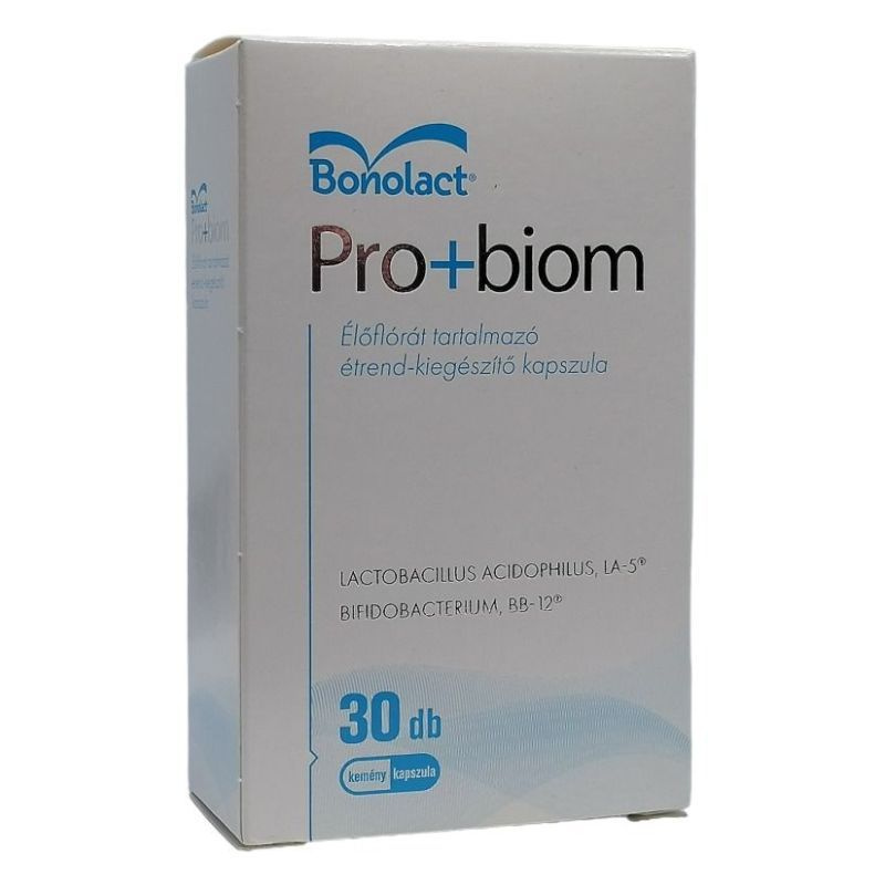 A 30 db-os Bonolact Pro+biom élőflórás étrend-kiegészítő kapszula Lactobacillus acidophilus LA-5® és Bifidobacterium animalis subsp. lactis BB-12® törzseket tartalmaz. A készítmény napi alkalmazás mellett támogathatja a bélflóra egyensúlyát. 3 éves kortól használható, kapszula formában vagy folyadékba keverve is fogyasztható. Alkalmas vegetáriánus és vegán étrendet követők számára is. Tárolása száraz, hűvös helyen ajánlott.