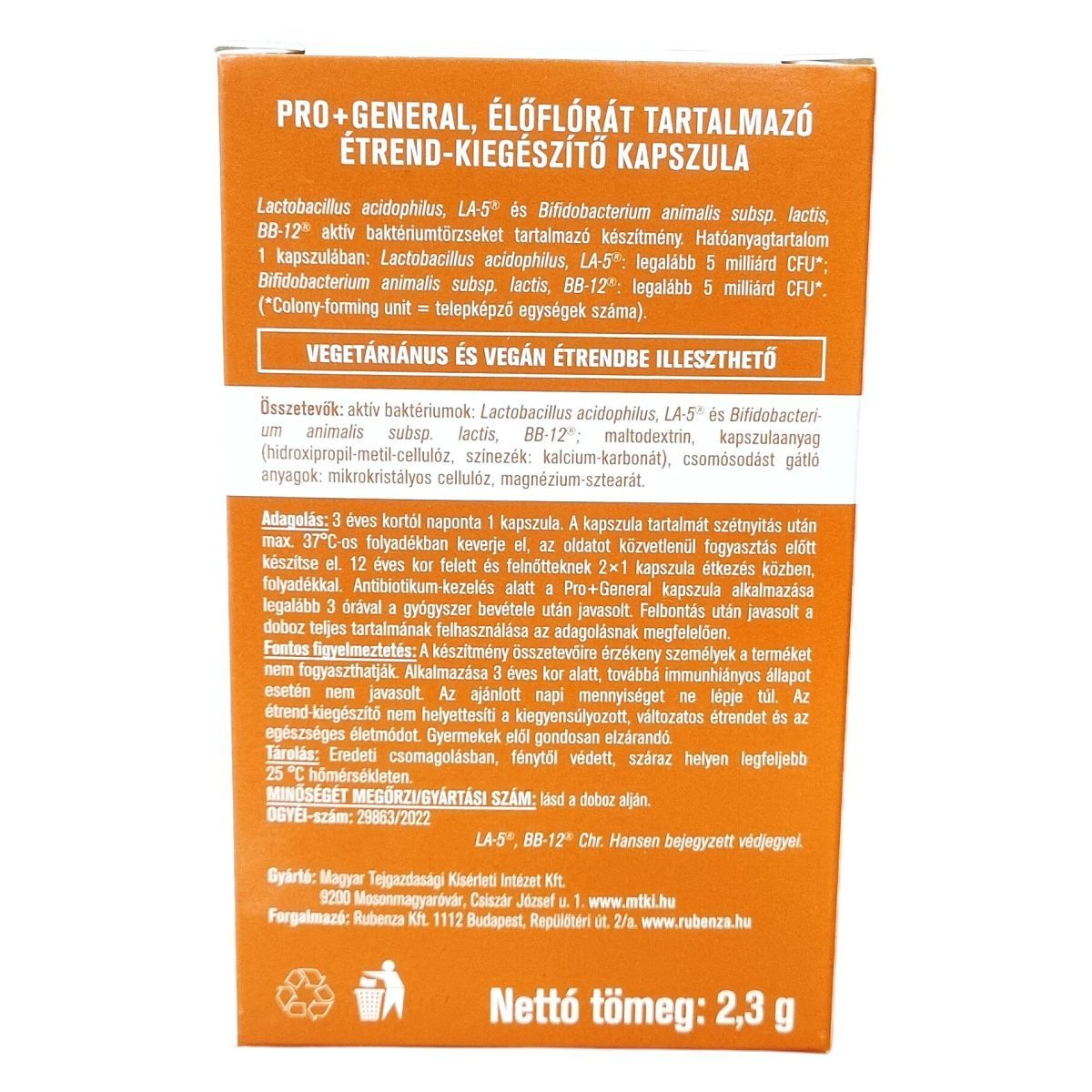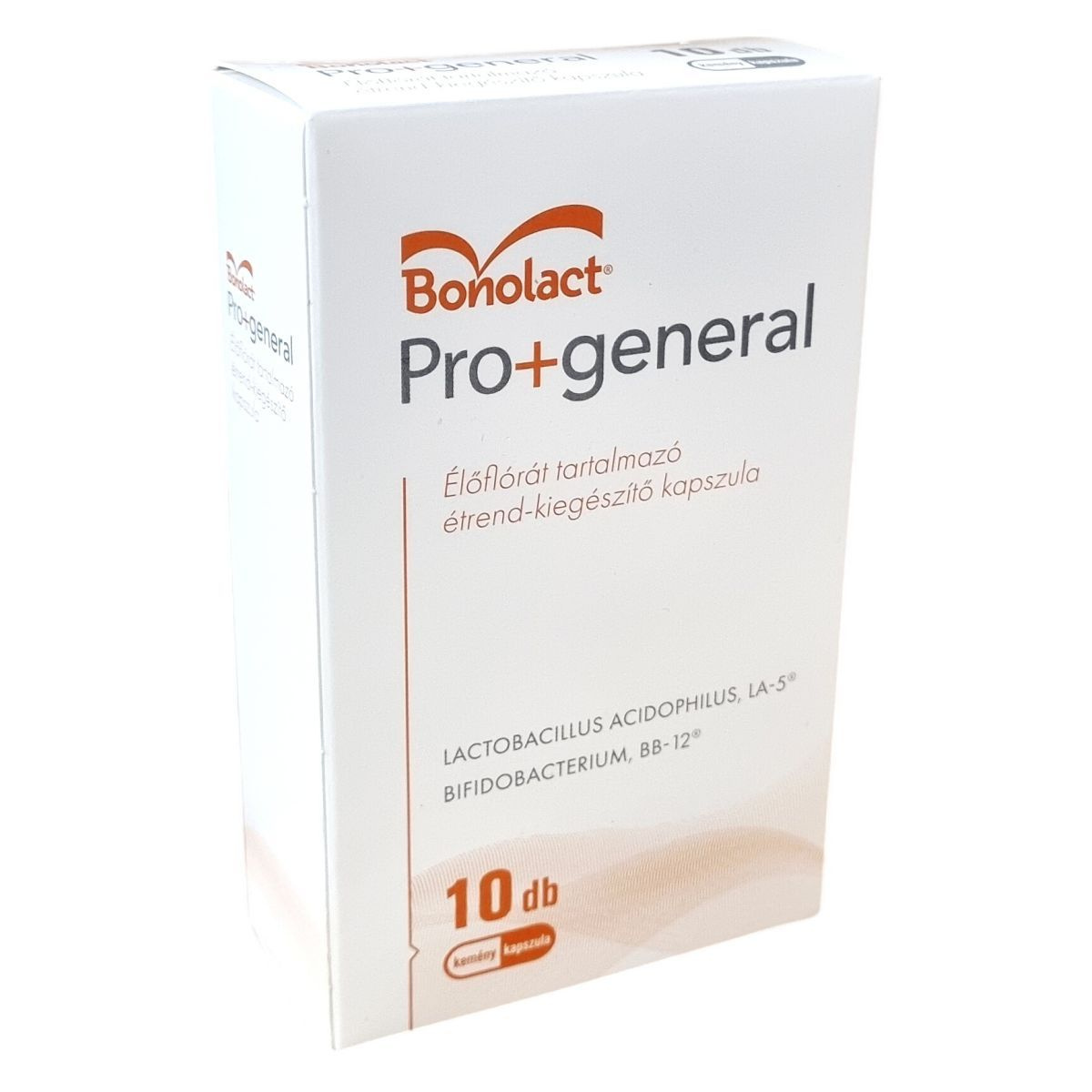 A Bonolact® Pro+general kapszula Lactobacillus acidophilus, LA-5® és Bifidobacterium animalis subsp. lactis, BB-12® aktív baktériumtörzseket tartalmaz, telepképző egységek számában kifejezve. A kapszulát 3 éves kortól ajánlott fogyasztani, napi adagja gyermekeknek egy kapszula, míg 12 éves kortól és felnőtteknek napi két kapszula, étkezés közben, folyadékkal. A kapszula tartalmát felbontás után maximum 37 °C-os folyadékban érdemes feloldani, és közvetlenül fogyasztani. Antibiotikum-kezelés esetén a kapszulát legalább három órával a gyógyszer bevétele után célszerű alkalmazni. A készítmény kapszulaanyagát hidroxipropil-metil-cellulóz alkotja, színezőanyagként kalcium-karbonátot tartalmaz, valamint csomósodást gátló anyagként mikrokristályos cellulóz és magnézium-sztearát található benne. Fontos, hogy az érzékeny személyek ne fogyasszák a terméket, valamint nem ajánlott három év alatti gyermekeknek és immunhiányos állapotban lévőknek. Megfelelő tárolás esetén a termék 25 °C alatt, száraz, fénytől védett helyen őrizhető meg legjobban. A termék LA-5® és BB-12® a Chr. Hansen bejegyzett védjegyei. A bontott csomagolás teljes tartalmát az ajánlott adagolás szerint érdemes felhasználni.