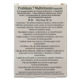 Élőflórát, inulint, vitaminokat és nyomelemeket tartalmazó speciális gyógyászati célra szánt tápszer. A Probikum7 élőflórás Multivitamin alkalmazása javasolt antibiotikus kezelést követően és bélrendszeri fertőzések után aktív baktériumok, egyes vitaminok és ásványi anyagok pótlására. Adagolás: Napi 2 x 1 szükség esetén 2 x 2 kapszula bőséges folyadékkal lenyelve, reggeli előtt és vacsora után.