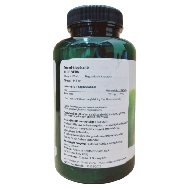 Az Aloe Vera étrend-kiegészítő kapszula formában érhető el, és 25 mg Aloe Vera kivonatot tartalmaz, amely 200:1 koncentrátumú, így megfelel 5 g friss Aloe zselének. A termék szójabab olajat, zselatint, glicerint, tisztított vizet, szilícium-dioxidot és méhviaszt is tartalmaz. Az ajánlott napi adag 1 kapszula, amely segíthet az általános jólét támogatásában. Fontos, hogy a terméket gyermekek elől elzárva, száraz és hűvös helyen tároljuk. A termék nem helyettesíti a vegyes étrendet és az egészséges életmódot.