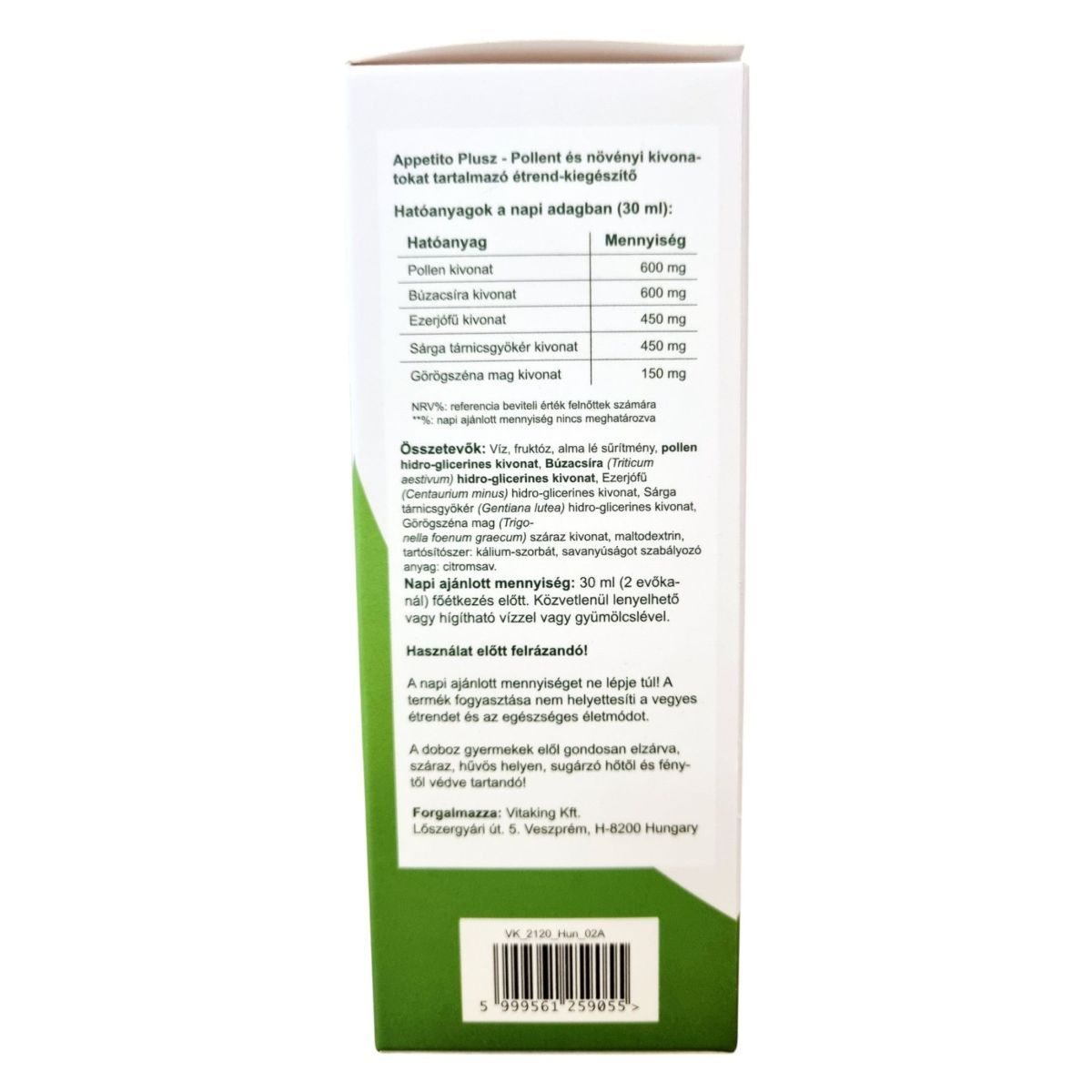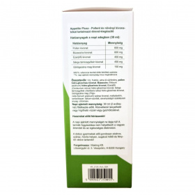 Az Appetito Plus egy természetes étrend-kiegészítő, amely pollen és különböző növényi kivonatokat tartalmaz. A termék célja, hogy támogassa az étvágyat és az emésztési folyamatokat. A görögszéna mag hozzájárulhat az étvágyhoz és segíthet fenntartani az egészséges életmód részeként a normál vércukorszintet. A sárga tárnicsgyökér segítheti az emésztést. A termék használata előtt felrázandó, és a napi ajánlott mennyiséget nem szabad túllépni. A termék nem helyettesíti a vegyes étrendet és az egészséges életmódot.
