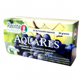 A Revita HUNGARY által forgalmazott AQUARES egy flavonoidokat és antioxidánsokat tartalmazó étrend-kiegészítő folyadék kapszula, amely vízoldható formában készült, így jobban felszívódhat. A készítményben található resveratrol hatóanyag hasznosulása nemzetközi szabadalom alapján fejlesztett technológiával lényegesen jobb, mint a por alakú készítmények esetében. A kapszula napi két darabos adagjának összetevői között olajsav, resveratrol és C-vitamin (aszkorbinsav) szerepel, melyek a szervezet egészséges működését támogathatják. A termék kizárólag tisztán előállított összetevőket tartalmaz, és a tárolási körülményeket figyelembe véve megőrzi minőségét a dobozon feltüntetett időpontig.