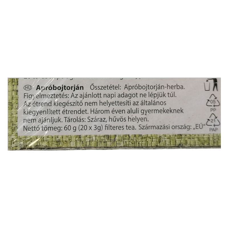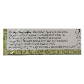 Növeli az étvágyat és segíti a gyomorsav termelődést. Emésztőrendszeri panaszok kezelésére is alkalmas. Használhatjuk szájüreg és torok öblögetésre. Összetétel: apróbojtorján. Nettó tömeg: 60 g, 20 db 3 g-os filter tasak. Elkészítése: 1 filter tasakot leforrázunk 0,5 l forró vízzel, majd 10 percig állni hagyjuk.