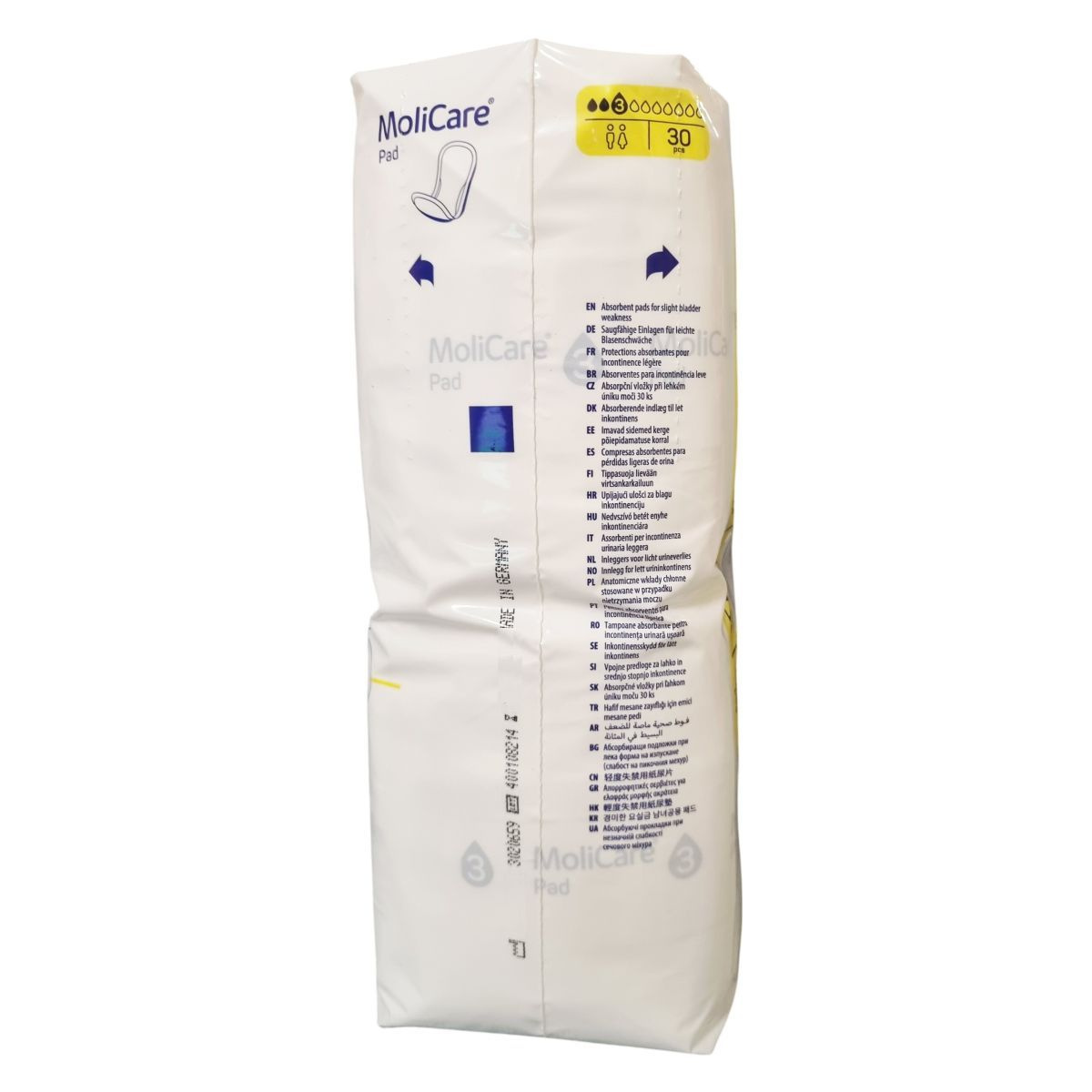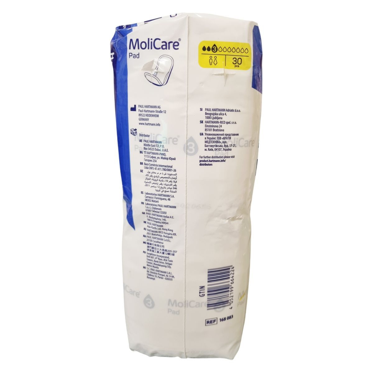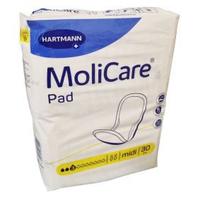 A Hartmann MoliCare Pad „midi” változata 30 darab betétet tartalmaz, amelyek enyhe vizeletszivárgás esetén nyújtanak diszkrét védelmet. A csomagoláson több nemzetközi fordítás is olvasható, amelyek mind megerősítik, hogy a termék könnyű inkontinenciára készült. A sárga ikonrendszer alapján 3 cseppes nedvszívó képességgel rendelkezik. A betét bőrbarát, pH-kiegyensúlyozott, szellőző és szivárgásgátló kialakítással bír. A csomagolás vizuális felhasználási útmutatót tartalmaz, valamint jelzi, hogy a termék Németországban készült.