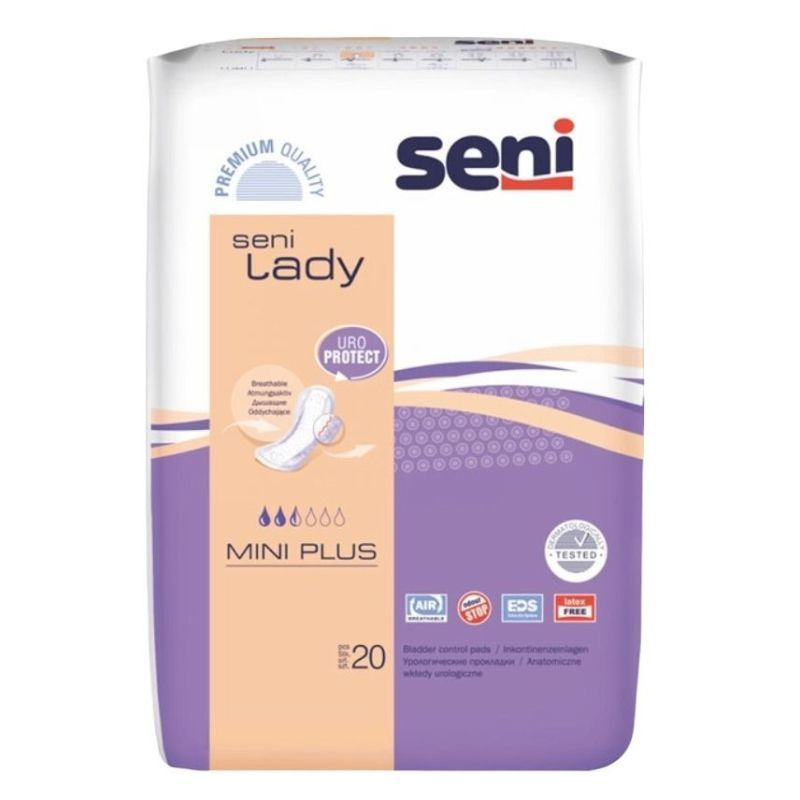 A légáteresztő, anatómiailag formált SENI LADY MINI PLUS inkontinencia betét tökéletes megoldás enyhe fokú inkontinencia esetén: igazodik a test vonalához, megbízható védelmet nyújt a kiszivárgással szemben. Semlegesíti a kellemetlen szagokat, felső rétege a nagyobb mennyiségű híg folyadékot (vizelet, szülés utáni váladék) is gyorsan elvezeti, majd nem engedi visszanedvesedni, így felszíne száraz marad. Teljes hosszában ragasztócsíkkal rögzíthető a fehérneműhöz, nem gyűrődik és nem mozdul el a helyéről.