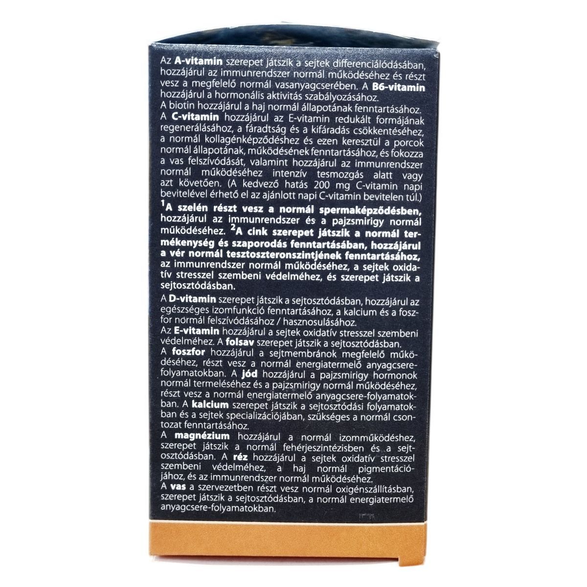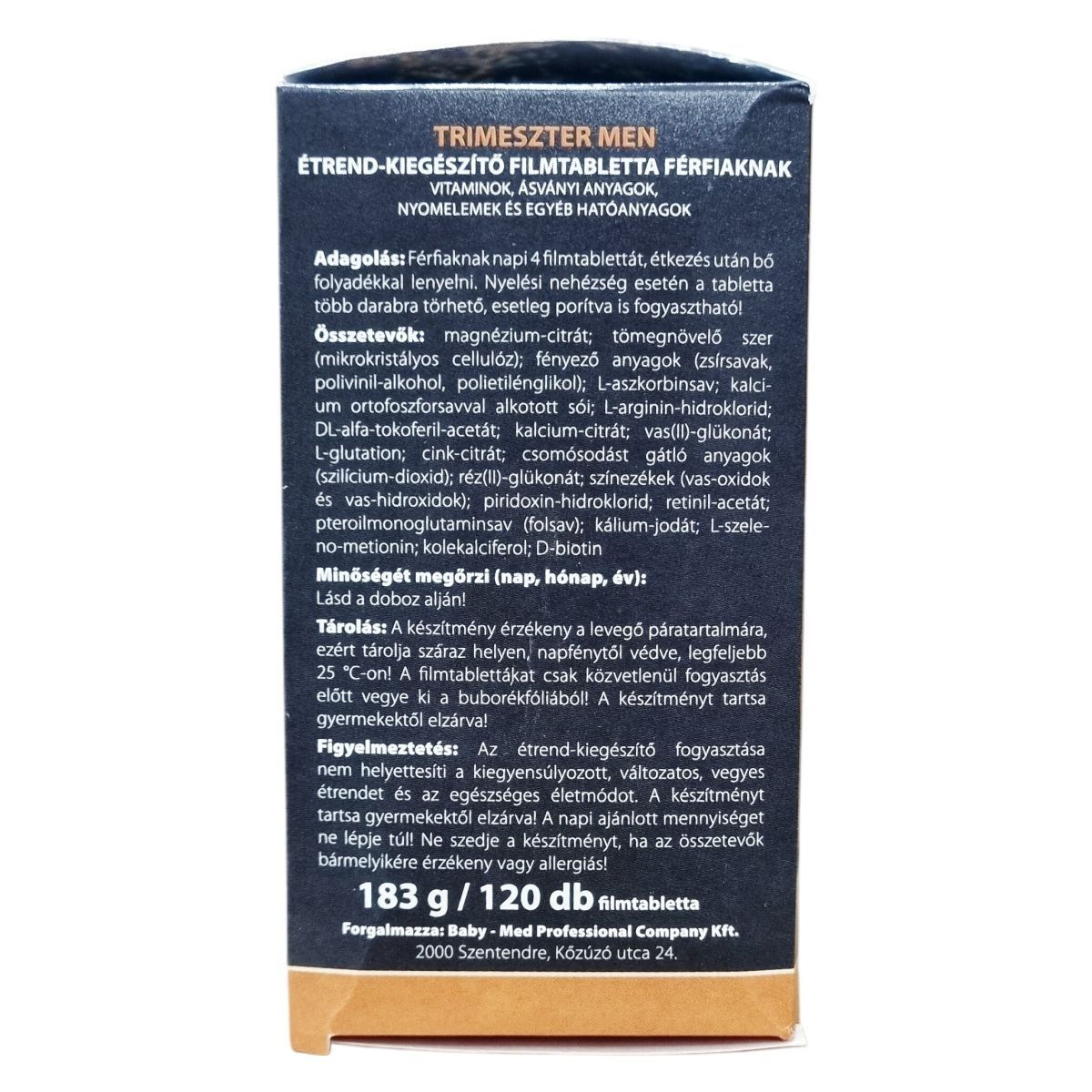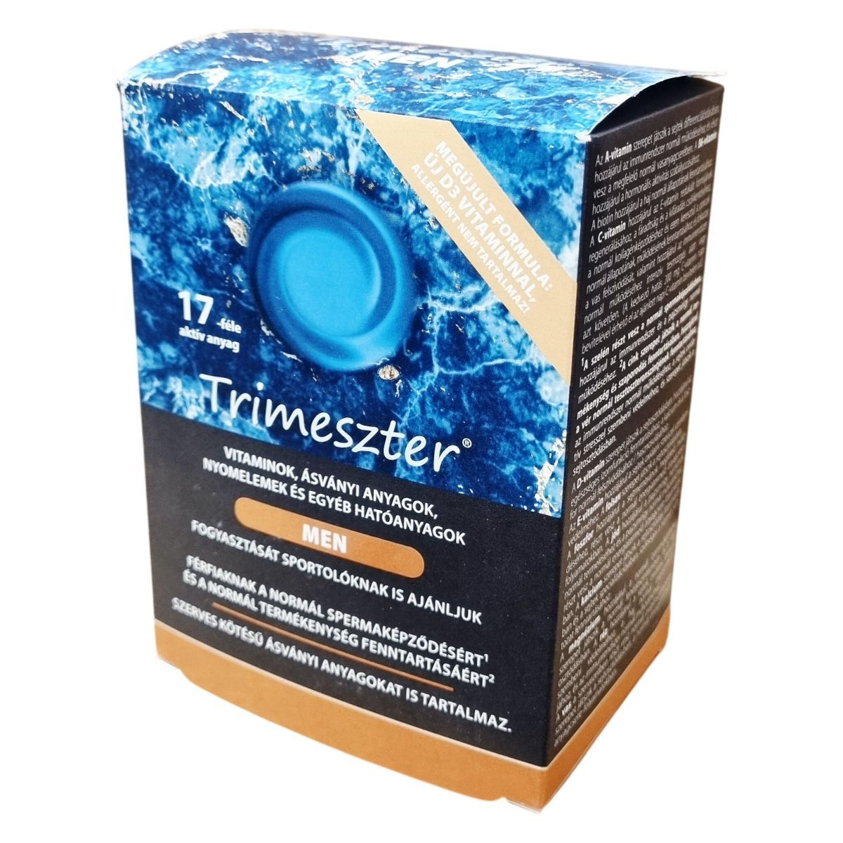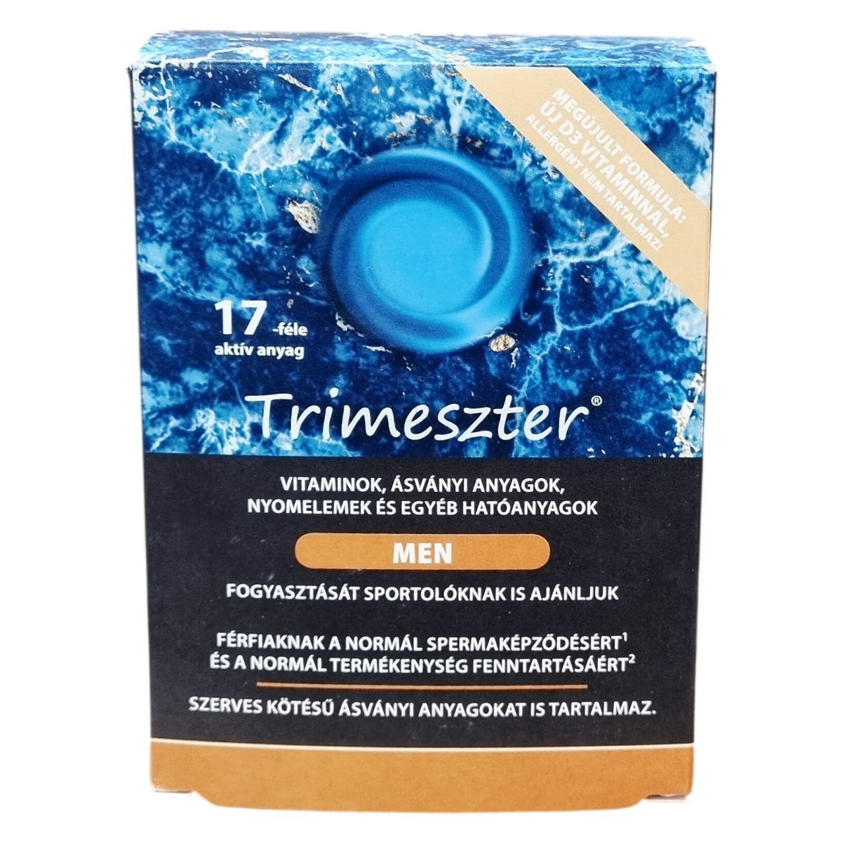 A Trimeszter Men étrend-kiegészítő filmtabletta vitaminok, ásványi anyagok, nyomelemek és egyéb hatóanyagok kombinációját tartalmazza, különösen férfiak számára fejlesztve a normál spermaképződés és termékenység fenntartása érdekében. Új D3-vitamin tartalommal rendelkezik, és allergénmentes összetételű. Szerves kötésű ásványi anyagokat, például magnéziumot, cinket, rezet és szelént is tartalmaz, valamint kalciumot és vasat is szerves formában. Az A-vitamin részt vehet a sejtek differenciálódásában és az immunrendszer működésében, míg a B6-vitamin hozzájárulhat a hormonális aktivitás szabályozásához. A C-vitamin fokozhatja a vas felszívódását, segítheti a kollagén képződését és az immunrendszert intenzív testmozgás alatt. A szelén szerepet játszhat a spermaképződésben és a pajzsmirigy működésében. A cink hozzájárulhat a normál termékenységhez, a tesztoszteronszint fenntartásához, és az immunrendszer védelméhez. A termék támogathatja a sejtosztódást, az egészséges izomfunkciót, valamint a normál energiatermelő anyagcsere-folyamatokat is. Alkalmassá teheti a sportolók számára is a fogyasztását, mivel komplex összetétele révén hozzájárulhat a szervezet egészséges működéséhez.