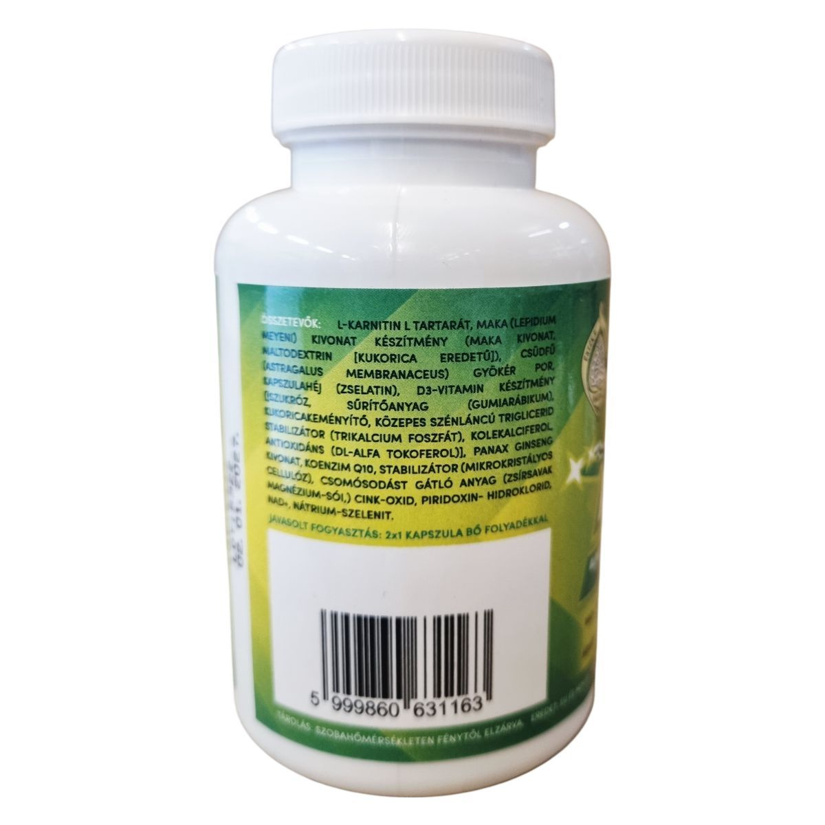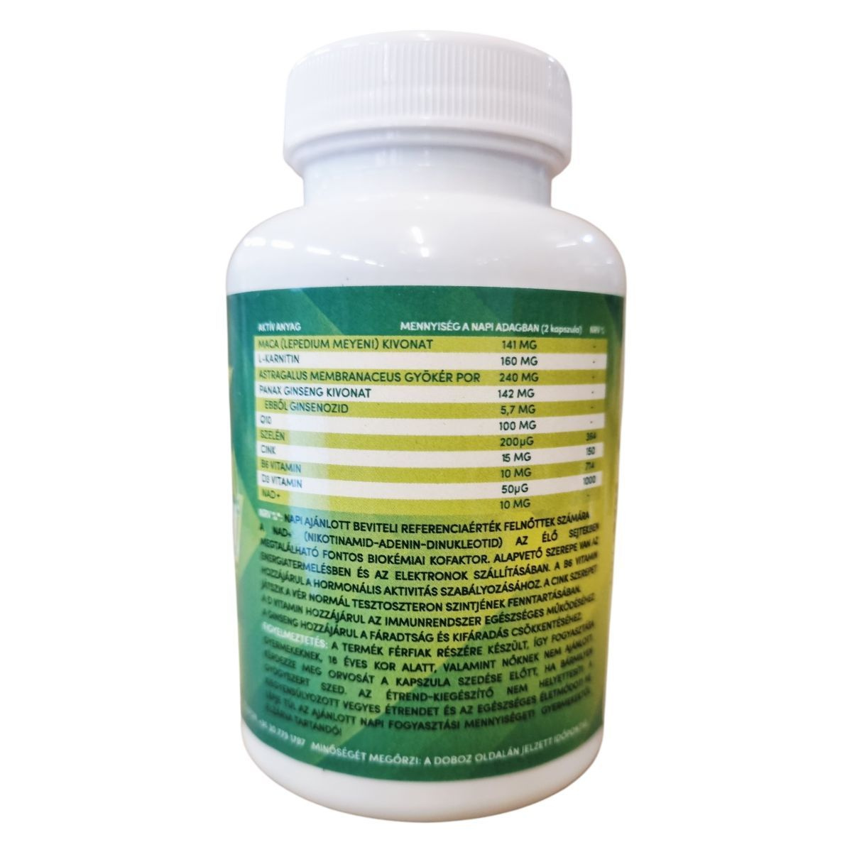 L-karnitin L-tartarát, Maca (Lepidium meyeni) kivonat készítmény (Maca kivonat, maltodextrin [kukorica eredetű]), csüdfű (Astragalus membranaceus) gyökér por, kapszulahéj (zselatin), D3-vitamin készítmény (szukróz, sűrítőanyag (gumiarábikum), kukorica keményítő, közepes szénláncú triglicerid, stabilizátor (trikalcium foszfát), kolekalciferol, antioxidáns (dl-alfa tokoferol)), Panax ginseng kivonat, koenzim Q10, stabilizátor (mikrokristályos cellulóz), csomósodást gátló anyag (zsírsavak magnézium-sói), cink-oxid, piridoxin-hidroklorid, NAD+, nátrium-szelenit