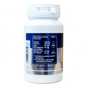 L-arginin-hidroklorid, L-karnitin-L-tartarát, zselatin, cink-szulfát, fenyőkéreg kivonat, koenzim Q10, tömegnövelő (mikrokristályos cellulóz), kolekalciferol, magnézium-sztearát