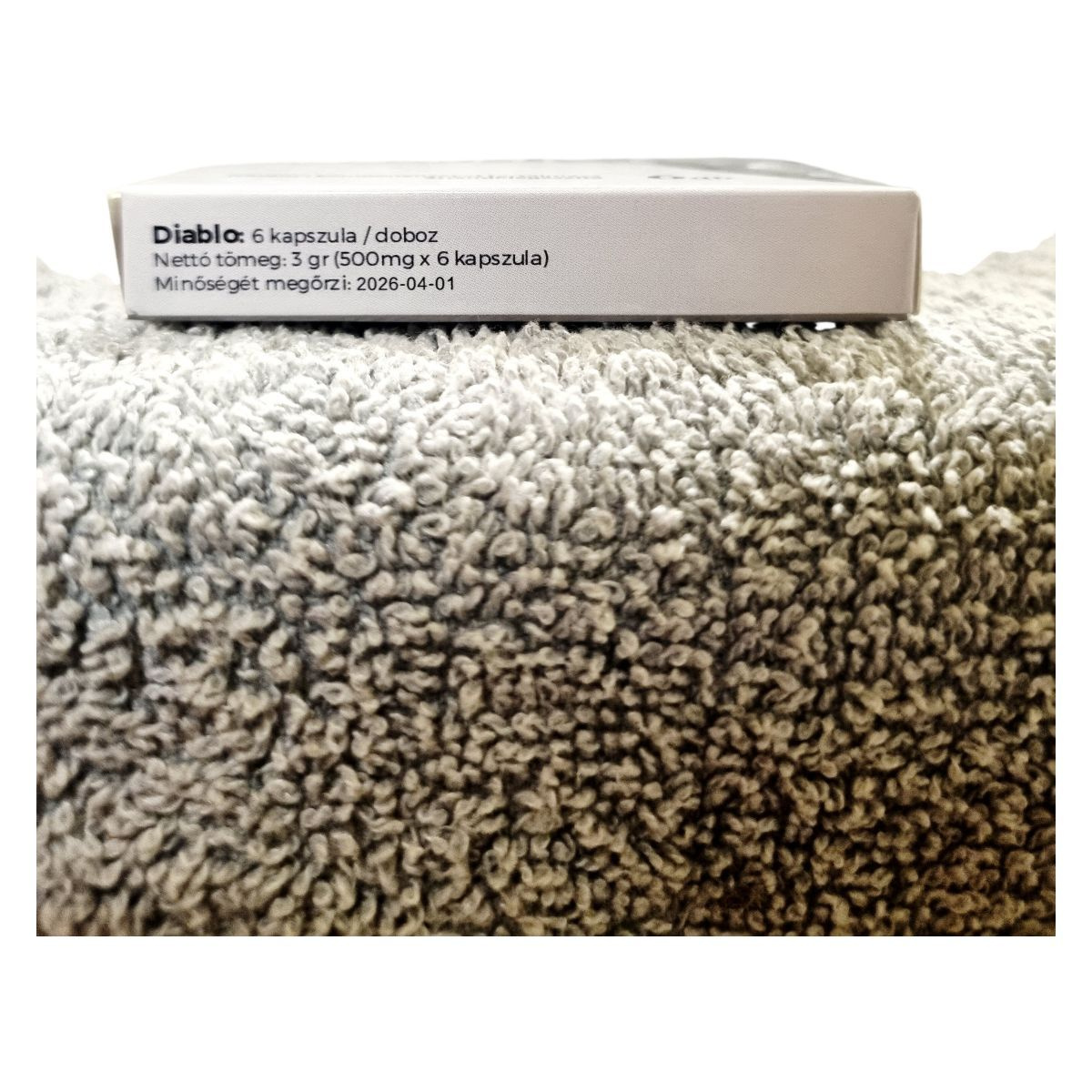 A Diablo étrendkiegészítő kapszula 6 darab 500 mg-os kapszulát tartalmaz, összesen 3 gramm nettó tömeggel. Kapszulánként a Maca gyökér por, Fűrész Pálma kivonat, Szibériai Ginseng kivonat és Gotu Kola kivonat van jelen, melyek mind növényi eredetűek. A termék nem helyettesíti a kiegyensúlyozott vegyes étrendet és az egészséges életmódot. A készítmény kifejezetten nem ajánlott magas vérnyomás, illetve szív- és érrendszeri betegségek esetén, illetve várandós és szoptató nők, valamint 12 éven aluli gyermekek részére. A terméket gyermekektől távol kell tartani.