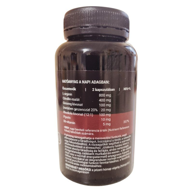 L-arginin, citrullin-malát, kapszula anyaga: zselatin, ázsiai ginzeng (Panax ginseng) gyökér kivonat (20% ginzenozid), rozsgyökér (Rhodiola rosea) kivonat, fekete bors (Piper nigrum) termés kivonat (98% piperin), B6-vitamin.