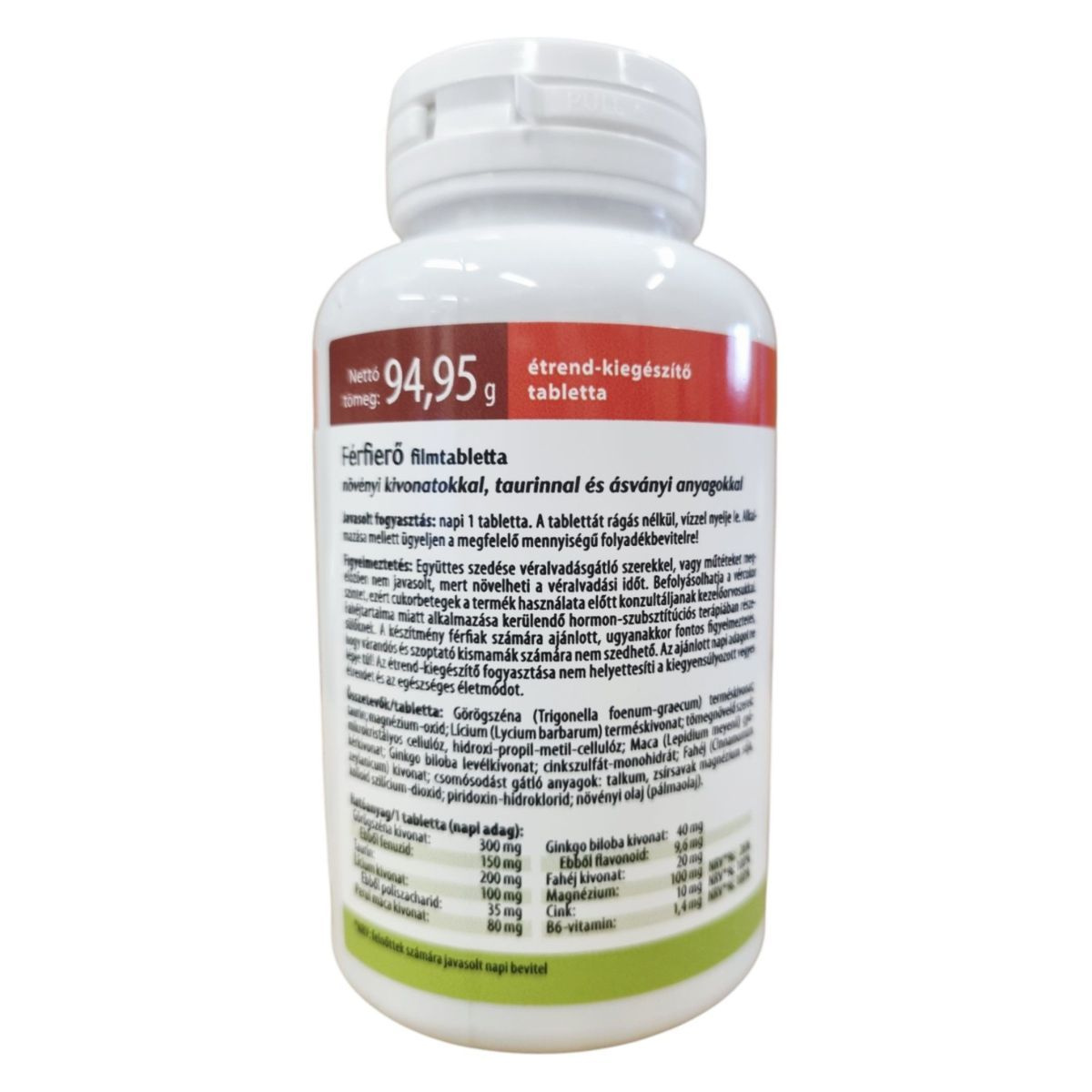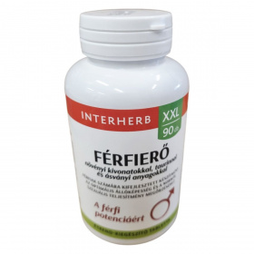 Az INTERHERB Férfierő étrend-kiegészítő tabletta kifejezetten férfiak számára készült, hogy támogassa az optimális állóképességet és a normál szexuális teljesítményt. A termék növényi kivonatokat, például görögszénát és Perui macát tartalmaz, amelyek hozzájárulhatnak a vitalitás fenntartásához. A cink és a B6-vitamin segíthet a hormonális aktivitás megőrzésében, míg a magnézium csökkentheti a fáradtságot. A Ginkgo biloba kivonat hozzájárulhat a megfelelő vérkeringés fenntartásához, a taurin pedig az izomszövetet építő aminosavlánc része. A termék használata előtt fontos figyelembe venni a figyelmeztetéseket, különösen véralvadásgátló szerek szedése esetén.