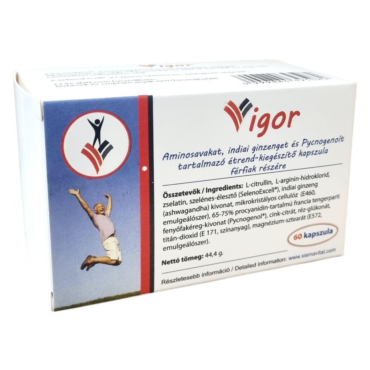 A Vigor kapszula olyan összetevőket tartalmaz, mint L-citrullin, L-arginin-hidroklorid, szelénes-élesztő (SelenoExcell®), indiai ginzeng (ashwagandha) kivonat, valamint a 65-75% procyanidin-tartalmú francia tengerparti fenyőfakéreg-kivonat (Pycnogenol®). A Pycnogenol® a Horphag Research Ltd. bejegyzett védjegye, alkalmazását több amerikai és nemzetközi szabadalom védi. A SelenoExcell® a Cypress Systems, Inc. bejegyzett védjegye. A termék 60 kapszulás kiszerelésben kerül forgalomba, és az adagolás naponta két kapszula. A készítmény tartalmaz zselatint és emulgeálószereket (mikrokristályos cellulóz, magnézium-sztearát), valamint titán-dioxidot, mint színanyagot. A termék kizárólag felnőttek részére ajánlott, 12 év alattiak, terhes és szoptató nők számára nem használható.