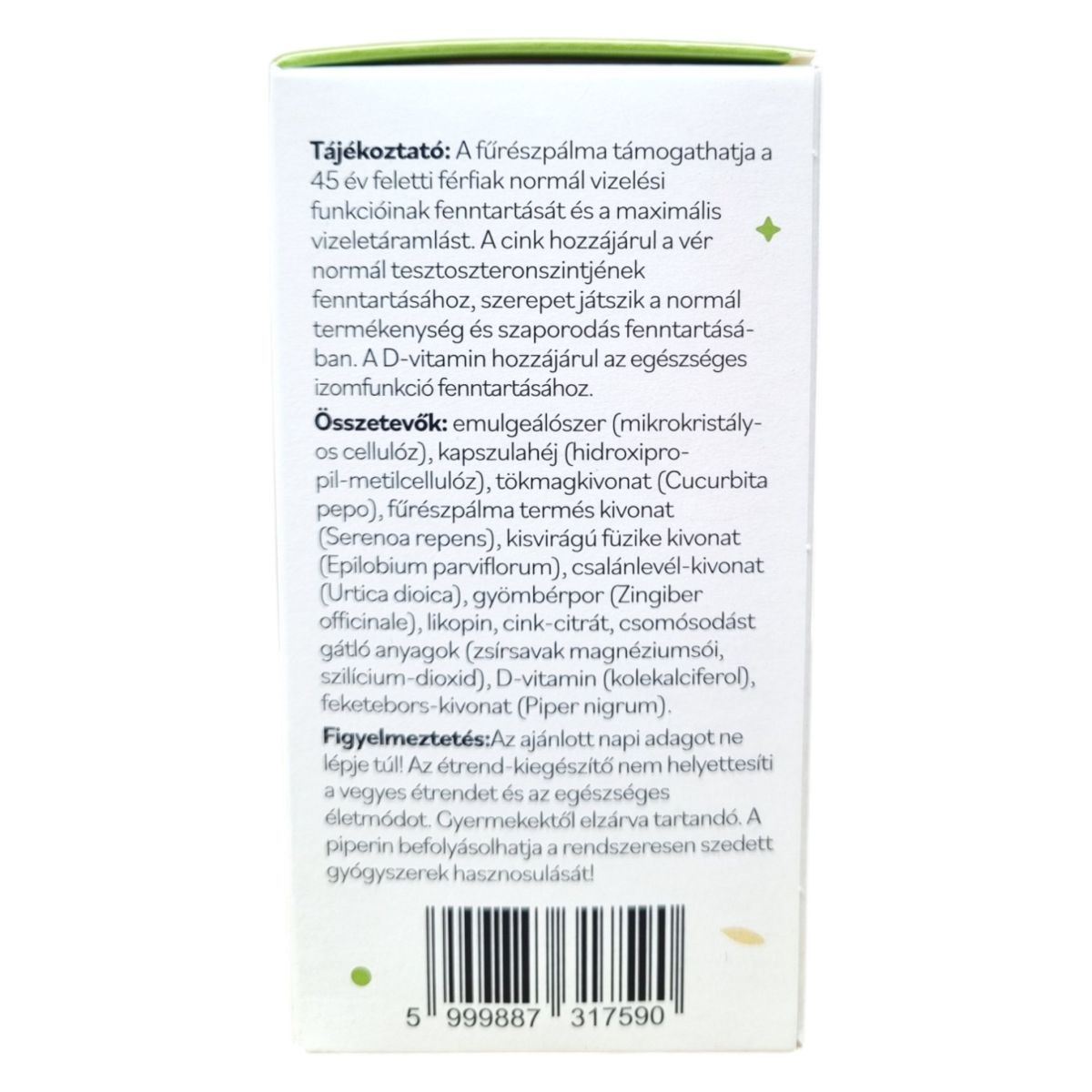 Emulgeálószer (mikrokristályos cellulóz), kapszulahéj (hidroxipropil-metilcellulóz), tökmagkivonat (Cucurbita pepo), fűrészpálma termés kivonat (Serenoa repens), kisvirágú füzike kivonat (Epilobium parviflorum), csalánlevél-kivonat (Urtica dioica), gyömbérpor (Zingiber officinale), likopin, cink-citrát, csomósodást gátló anyagok (zsírsavak magnéziumsói, szilícium-dioxid), D-vitamin (kolekalciferol), feketebors-kivonat (Piper nigrum).