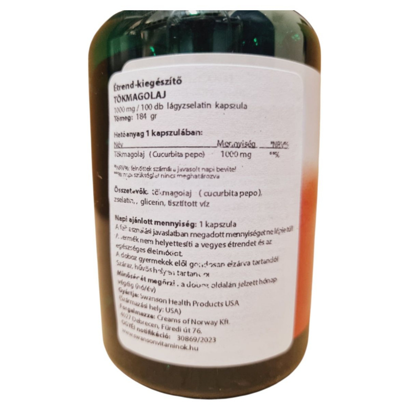 A Swanson Tökmagolaj kapszula 1000 mg tökmagolajat tartalmaz, amelyet a Cucurbita pepo növényből nyernek. A termék lágyzselatin kapszulák formájában kapható, és napi egy kapszula fogyasztása javasolt. A termék nem helyettesíti a vegyes étrendet és az egészséges életmódot, és fontos, hogy a dobozt gyermekek elől elzárva tartsuk. A kapszulák összetevői között megtalálható a zselatin, glicerin és tisztított víz. A termék gyártója a Swanson Health Products, és az OGYÉI notifikációs száma 30869/2023.