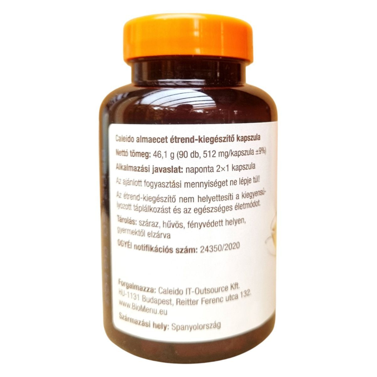 A Caleido Almaecet kapszula egy étrend-kiegészítő, amely 90 kapszulát tartalmaz, és Spanyolországból származik. A termék almaecet kivonatot tartalmaz, amely 35% savtartalommal bír, és hozzájárulhat az emésztés támogatásához. Az ajánlott napi adag 2 kapszula, amely összesen 160 mg almaecetet biztosít. A termék összetevői között szerepel a maltodextrin és a szarvasmarha zselatin. Fontos, hogy az ajánlott mennyiséget ne lépje túl, és az étrend-kiegészítő nem helyettesíti a kiegyensúlyozott táplálkozást. A terméket száraz, hűvös, fényvédett helyen kell tárolni, gyermekektől elzárva. Forgalmazója a Caleido IT-Outsource Kft., és a termék OGYÉI notifikációs száma 24350/2020.