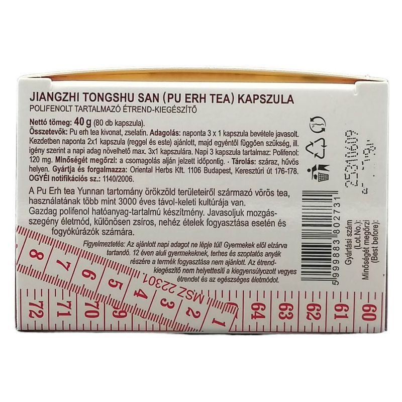 A Pu Erh Tea (vörös tea) előnyeit egyesíti magában a Pu erh kapszula. A kapszula étvágycsökkentő hatású, javítja a zsírok anyagcseréjét, korlátozza a koleszterinszintet, enyhe hashajtó, vízhajtó, gyulladás,- és vérnyomáscsökkentő hatású. A fogyókúra időtartama 30 napos, ajánlatos rövid szünetet tartani a következő kúra előtt. A kúra ideje alatt kerüljük a szeszes italokat és a pikáns, csípős ételeket. A kapszula zsíroldó hatása fokozható, ha több fehérjét és kevesebb zsiradékot, cukrot fogyasztunk.