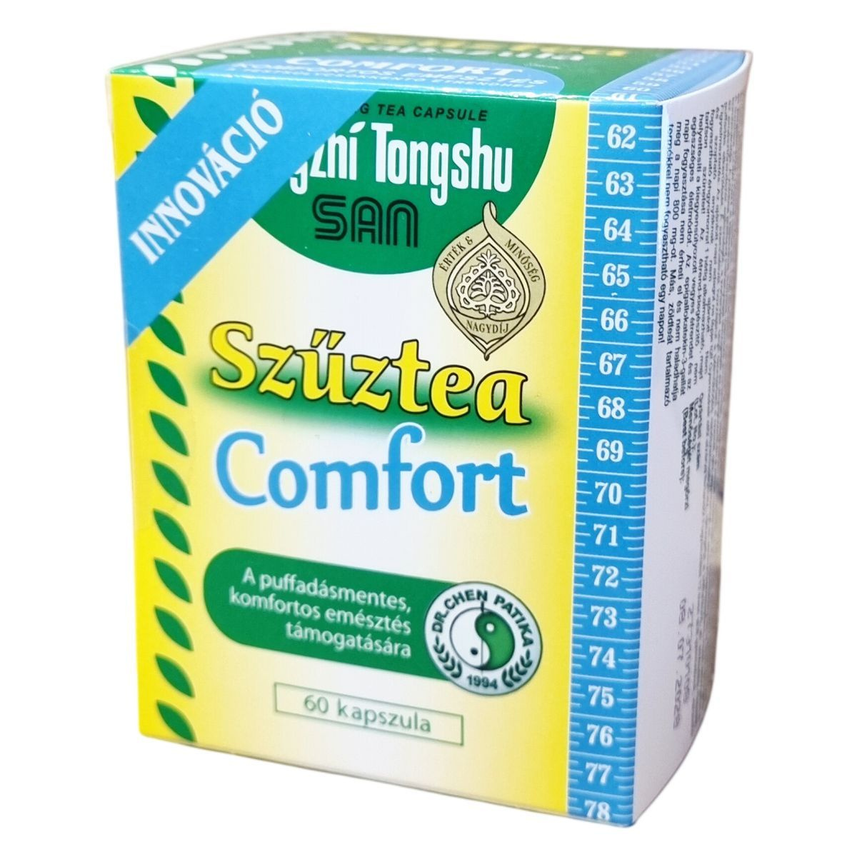 A Szűztea Comfort a hagyományos Szűztea új generációs fejlesztése, amely kifejezetten az emésztés normál gáz-egyensúlyának fenntartását célozza. Összetevői között megtalálható a zöldtea polifenol, mely hozzájárulhat az anyagcsere támogatásához és a zsírok oxidációjához, valamint az olyan gyógynövények, mint az édeskömény és az ánizs, amelyek az emésztőrendszer egészségét támogathatják. A koriander segíthet fenntartani a normál gáz-egyensúlyt, ezáltal támogatva a puffadás megelőzését, míg a szennalevél hozzájárulhat a bélműködés rendszerességéhez és az emésztés ritmusának fenntartásához. A termék nem helyettesíti a kiegyensúlyozott étrendet és az egészséges életmódot.