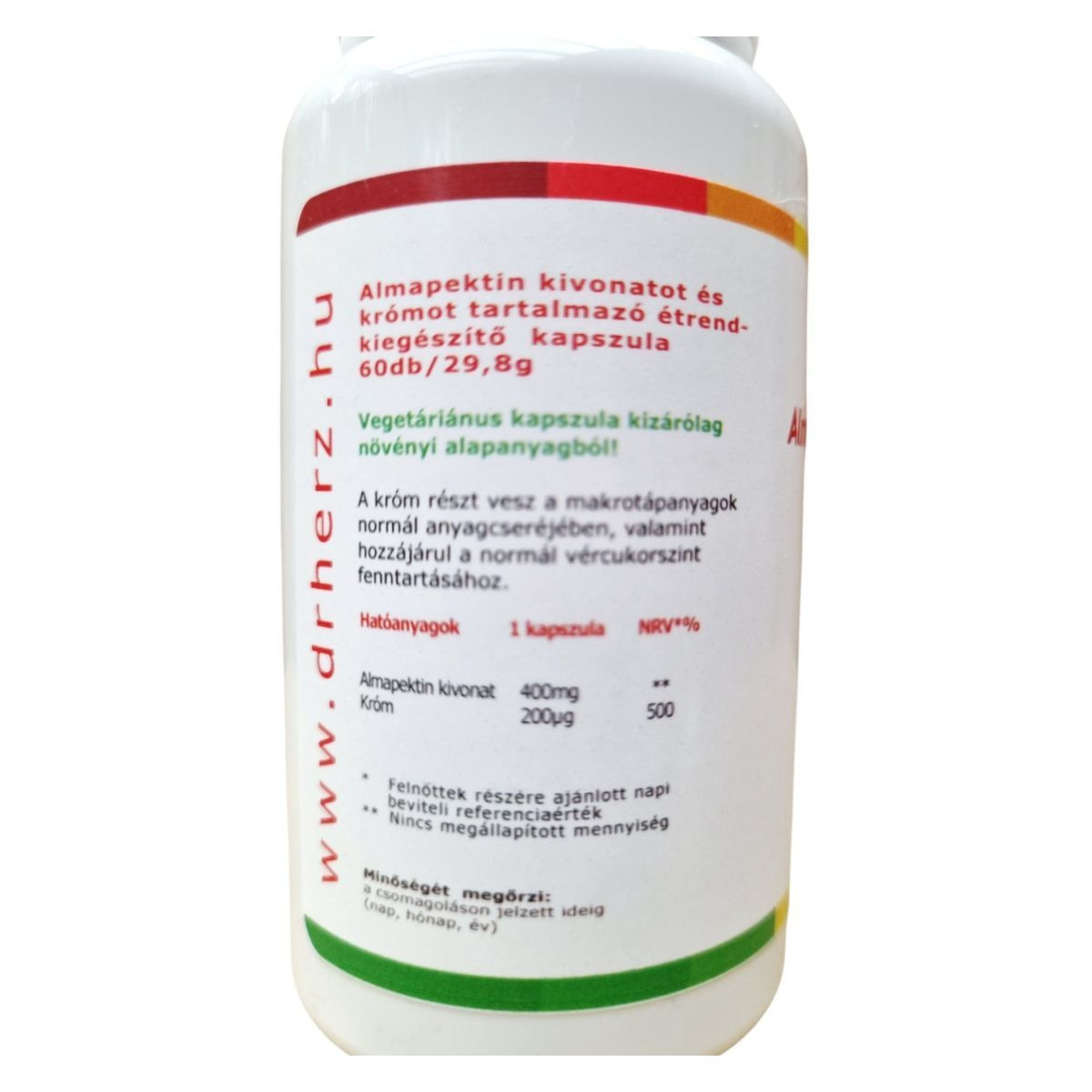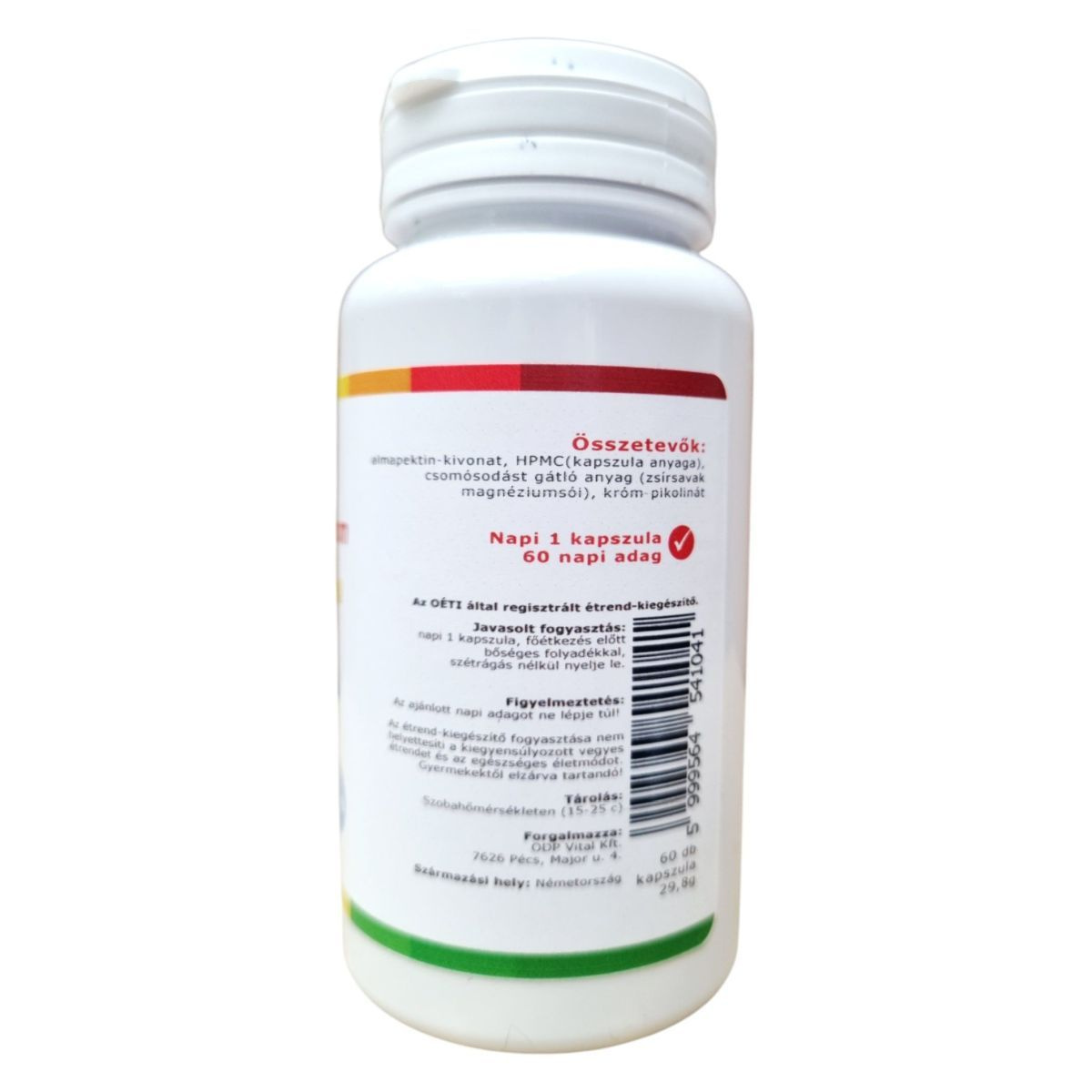 Az Almapektin Extraktum kapszula almapektin és króm tartalmával hozzájárulhat a makrotápanyagok normál anyagcseréjéhez és a normál vércukorszint fenntartásához. A termék vegetáriánus kapszulában érhető el, és kizárólag növényi alapanyagból készült. A termék 60 kapszulát tartalmaz, amely 60 napi adagot biztosít. Származási helye Németország, és a forgalmazója az ODP Vital Kft. A termék fogyasztása előtt fontos betartani az ajánlott napi adagot, és figyelembe venni, hogy az étrend-kiegészítő nem helyettesíti a kiegyensúlyozott étrendet.