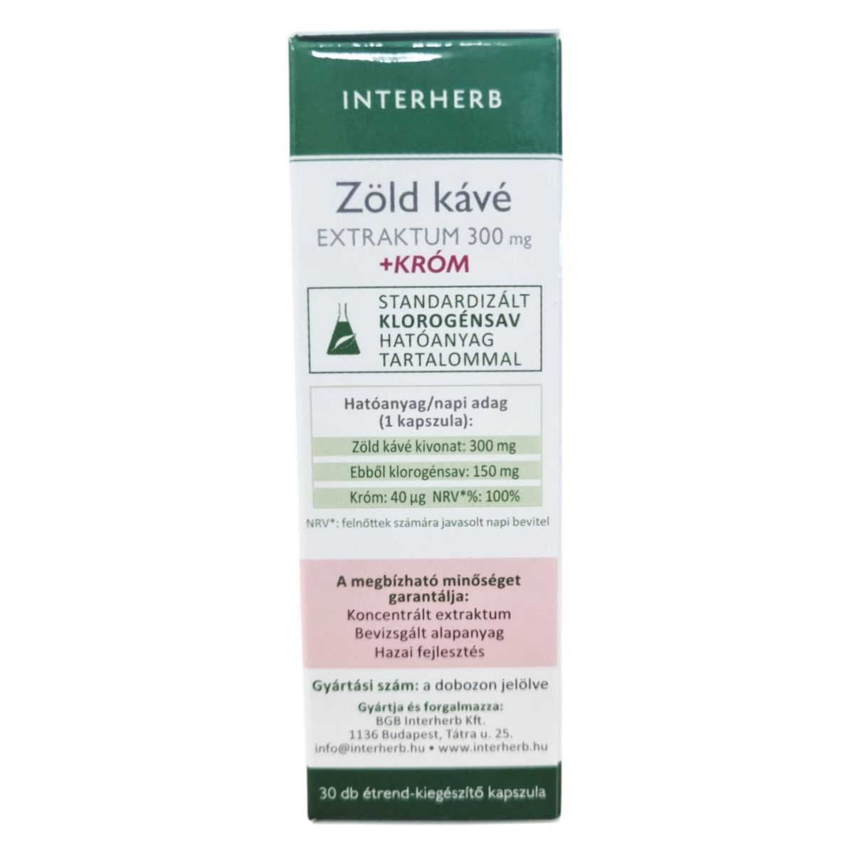 Zöld kávé kivonat: 300 mg (ebből klorogénsav: 150 mg), Króm: 40 µg (NRV%: 100%)